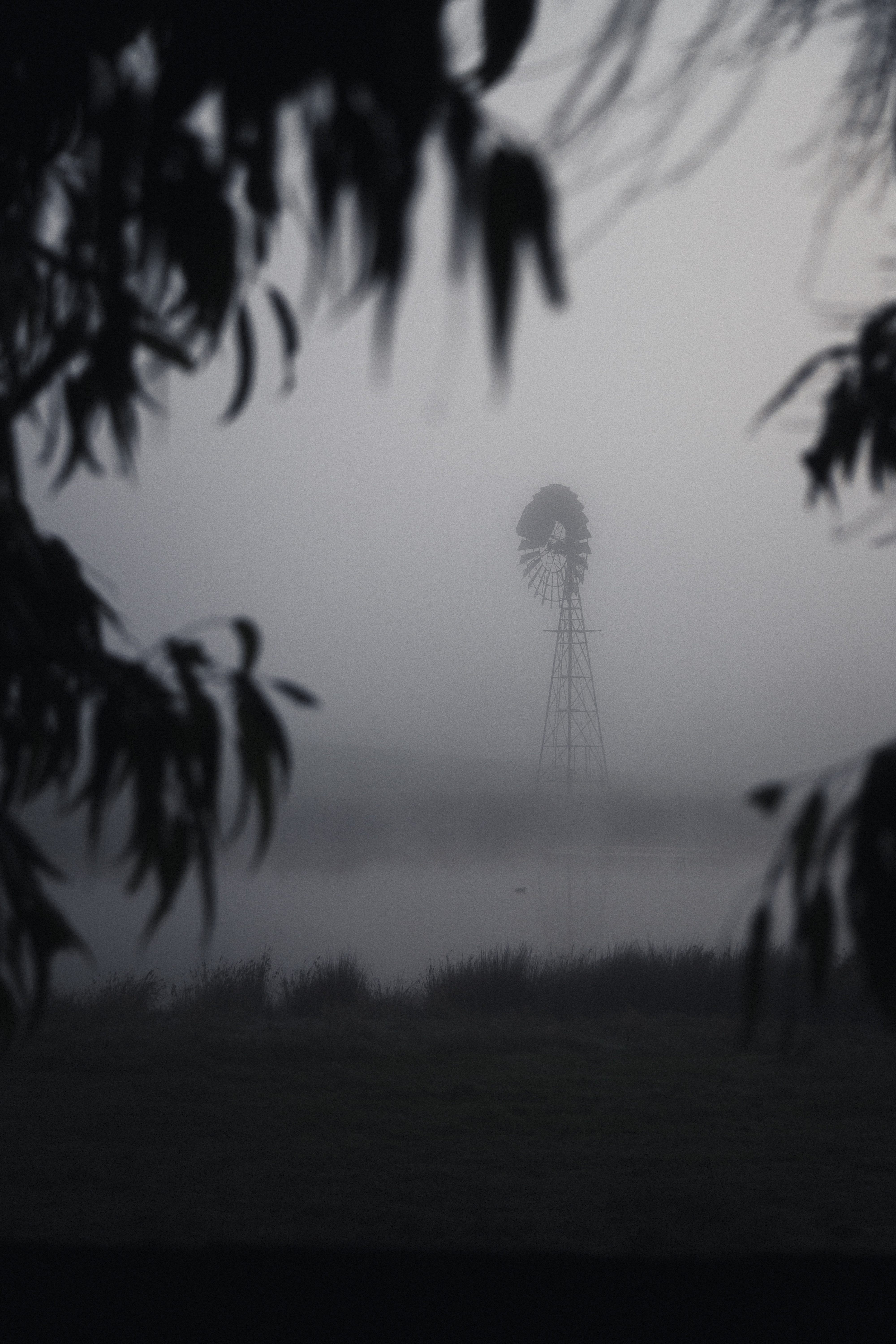A windmill stands alone in dense fog, framed by hanging willow branches in the foreground.