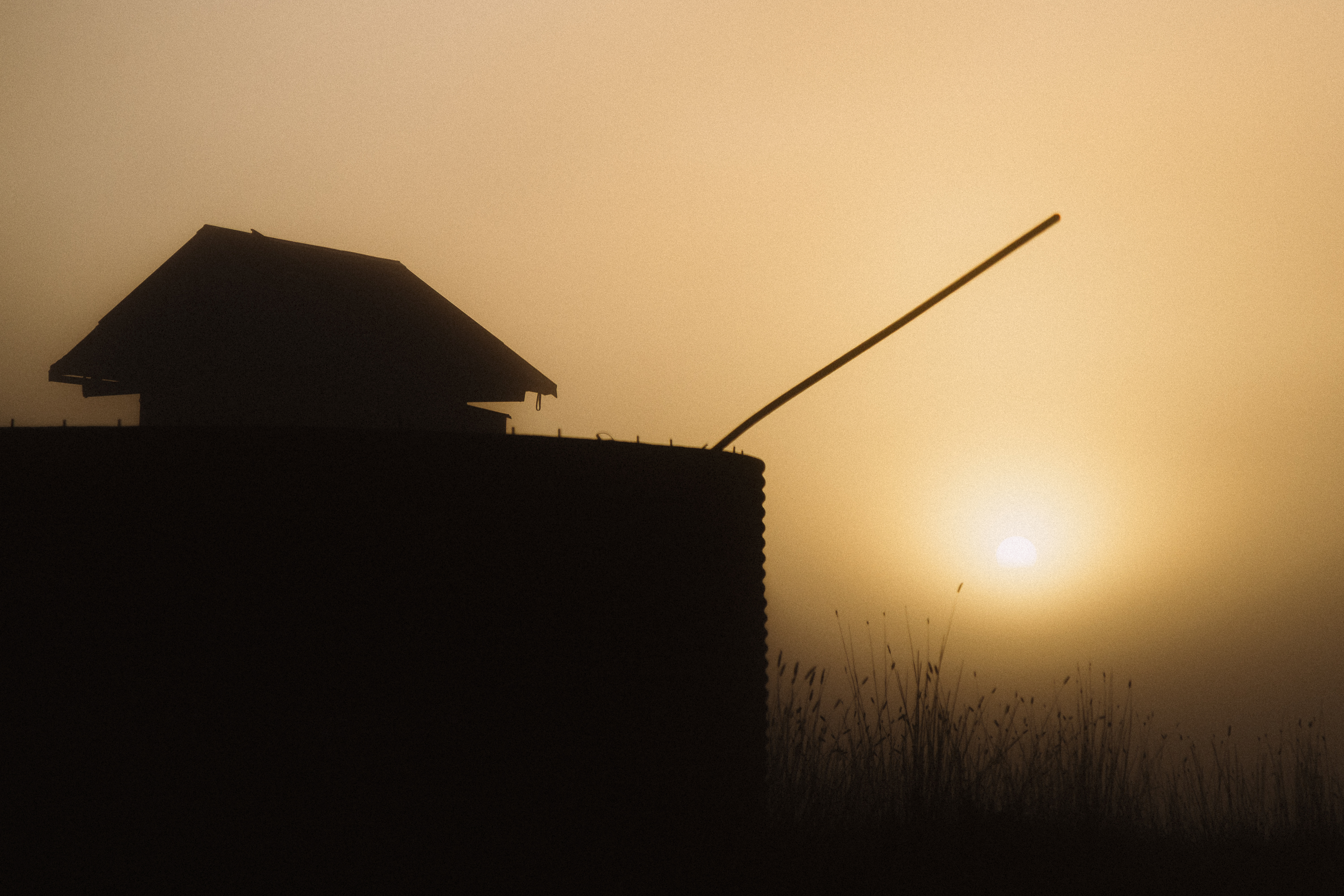 Silhouette of a historic fort structure with a long wooden pole against a golden sunset sky.