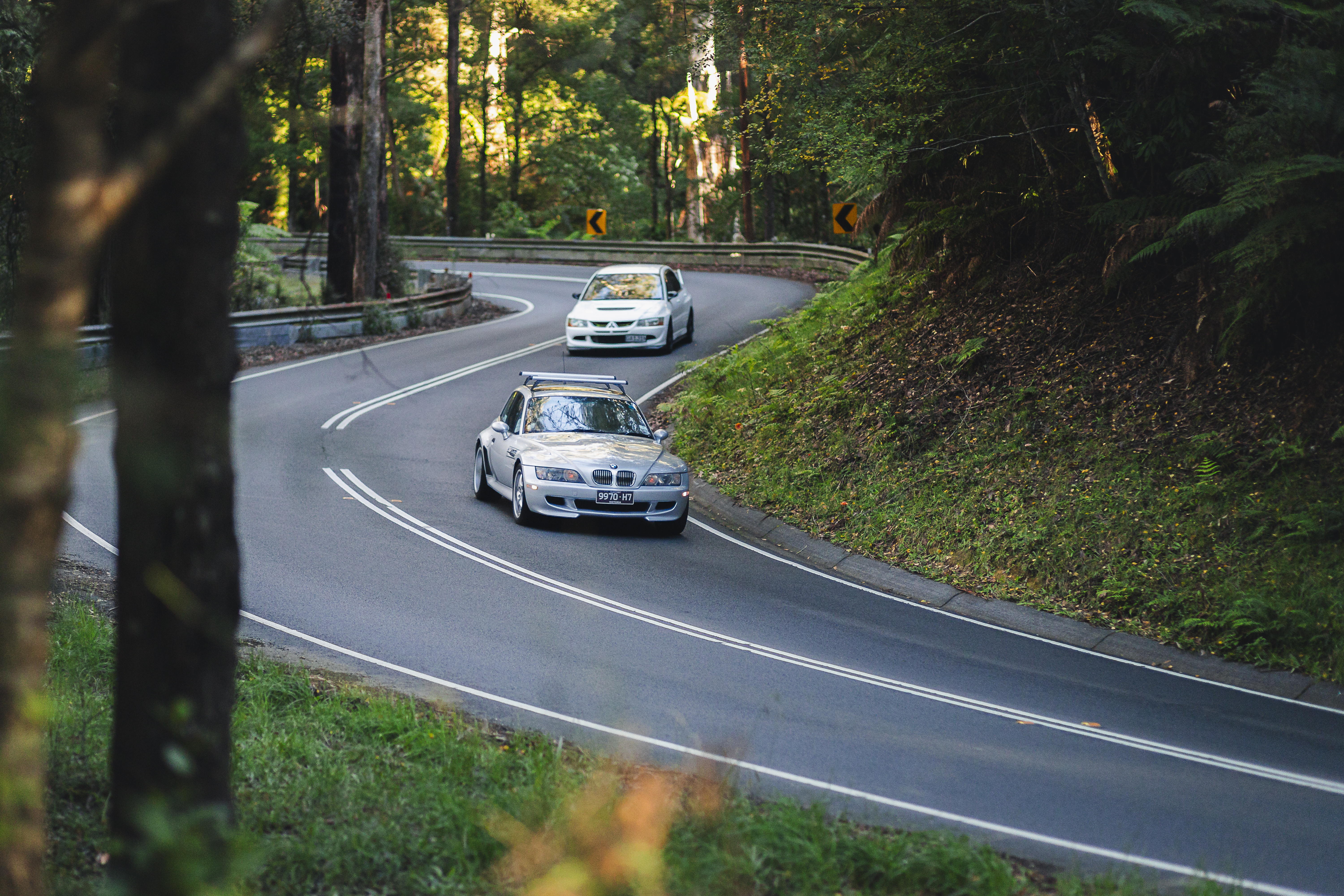 Two white BMW sports cars navigate a winding forest road with dense green vegetation on both sides.