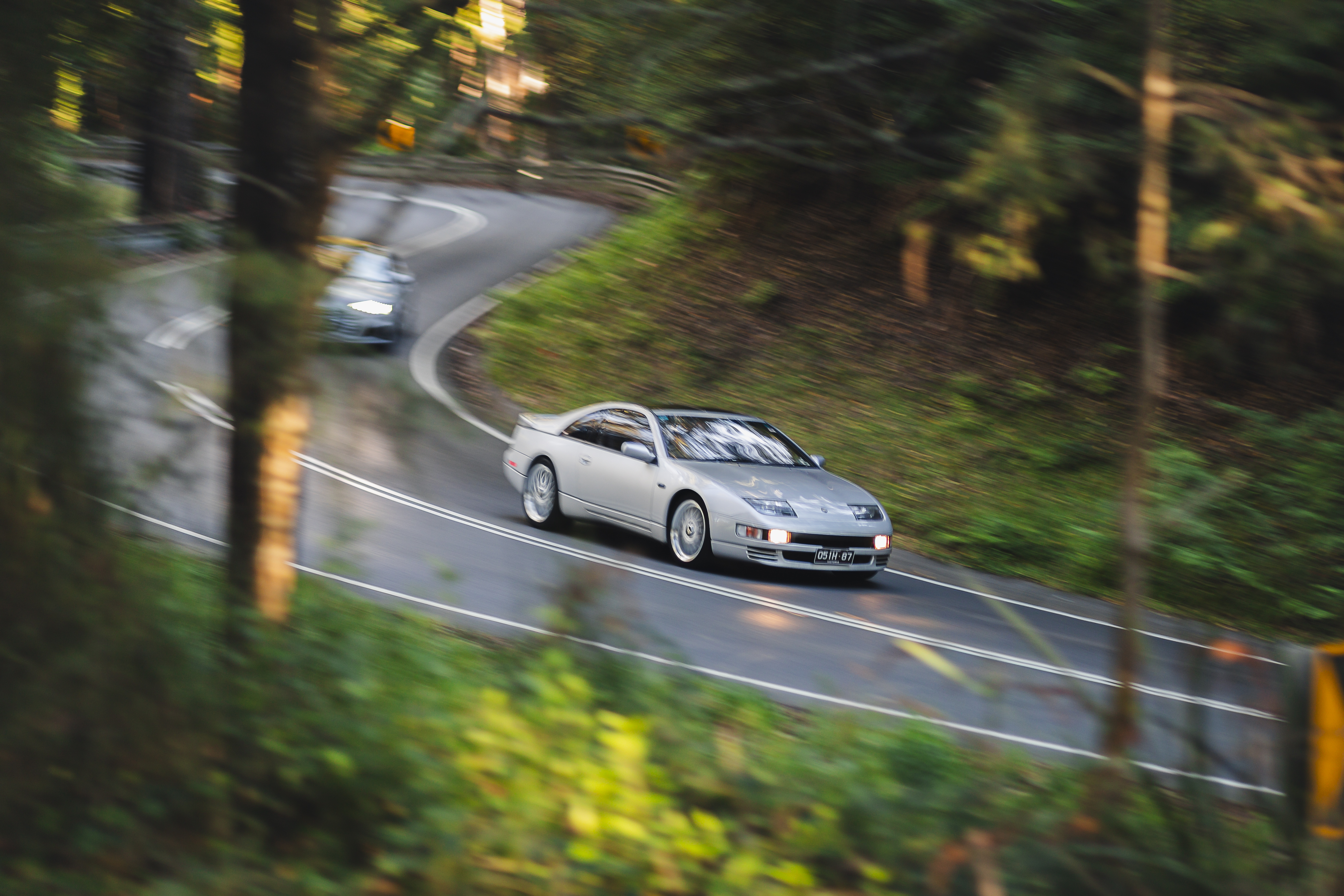 Silver sports car navigating a winding road through a forested area with trees lining both sides.