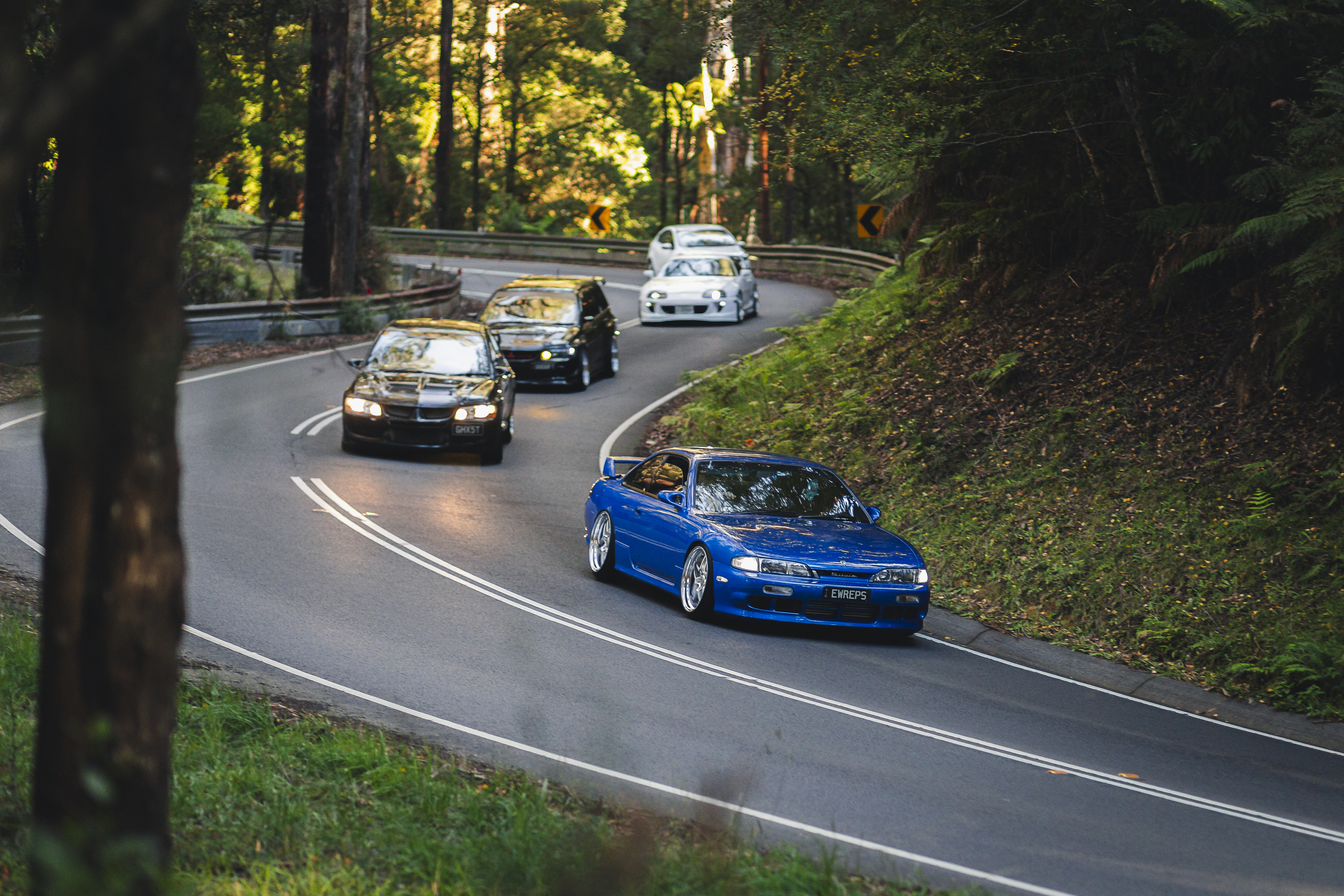 A blue sports car leads a convoy of vehicles through a forested road with dense green vegetation on both sides.
