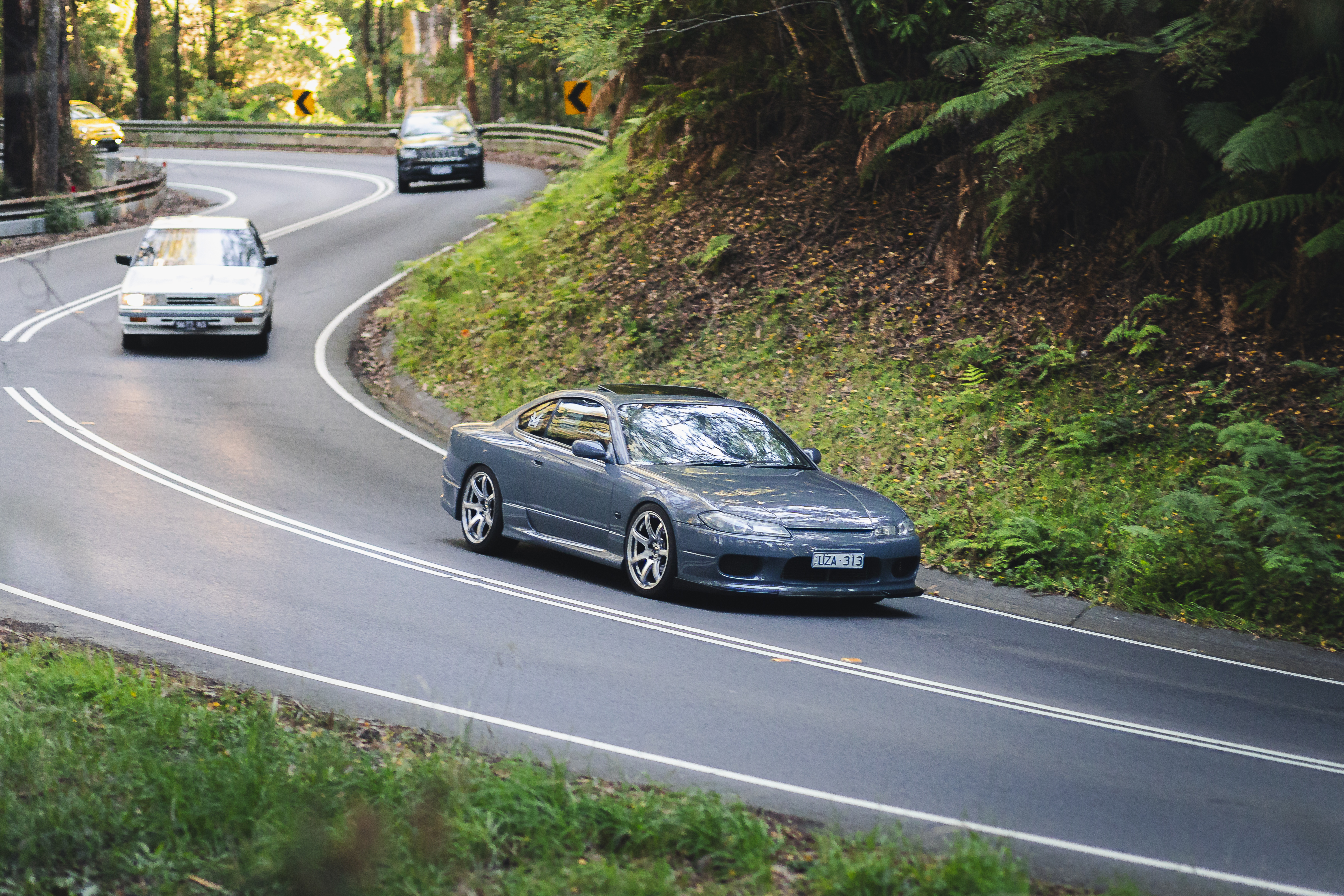 Three sports cars navigating a winding mountain road through dense forest with yellow warning signs visible ahead.