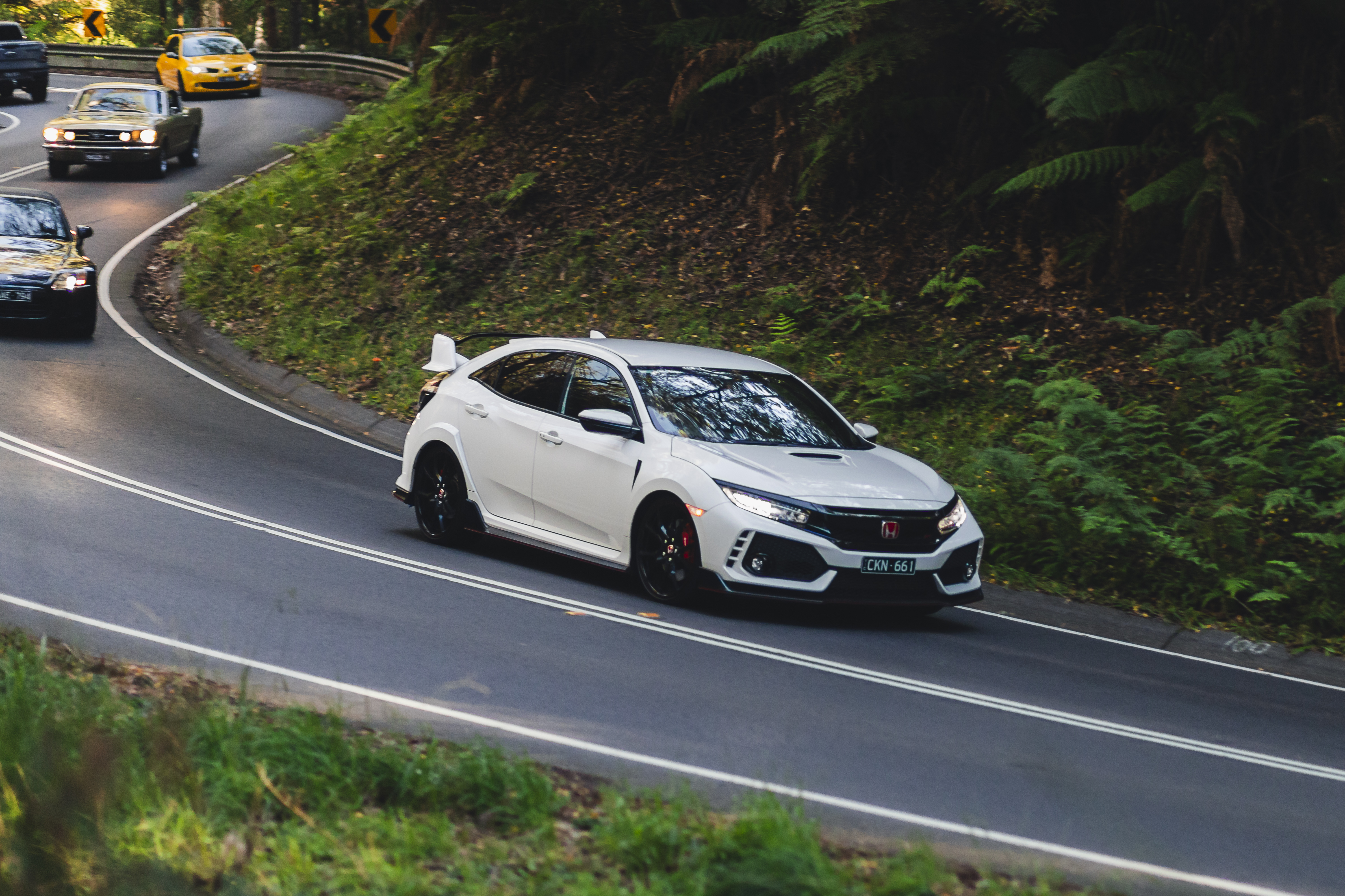 White performance hatchback navigating a forested mountain road with other vehicles visible in the distance.