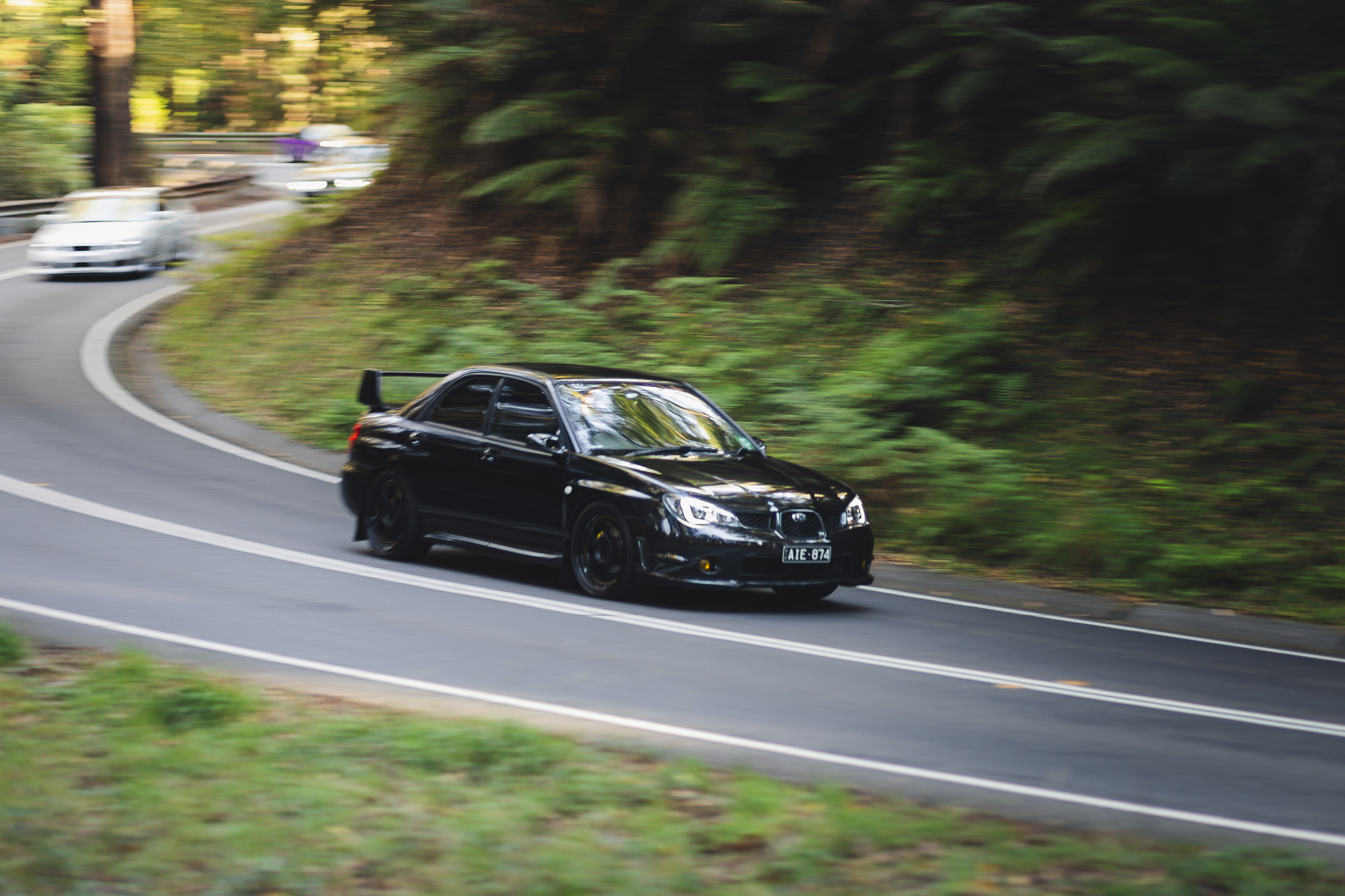 Black sedan navigating a curved road through dense green forest with a second vehicle visible on the road behind it.