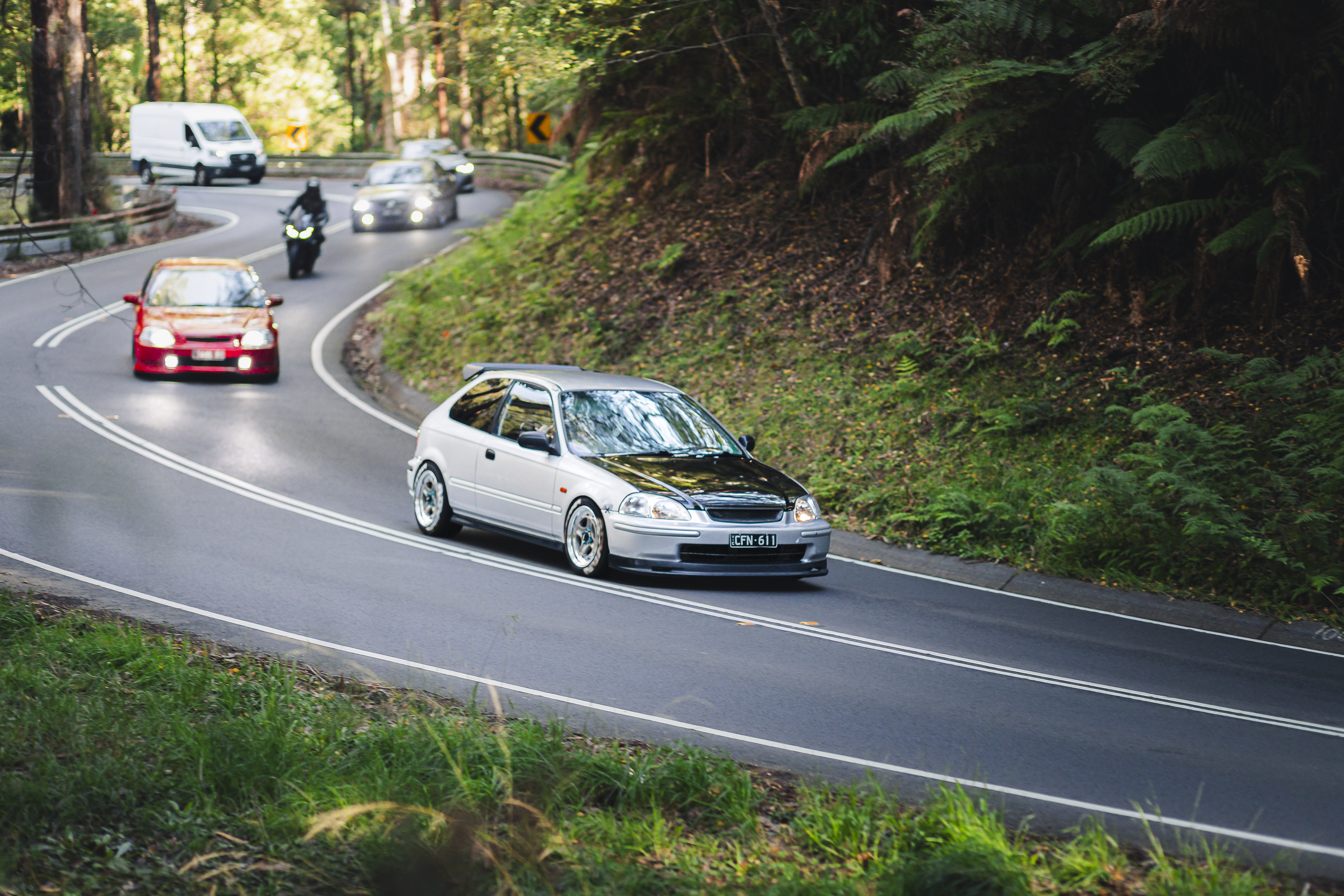 A white hatchback leads a convoy of vehicles through a forested mountain road with lush green vegetation lining both sides.