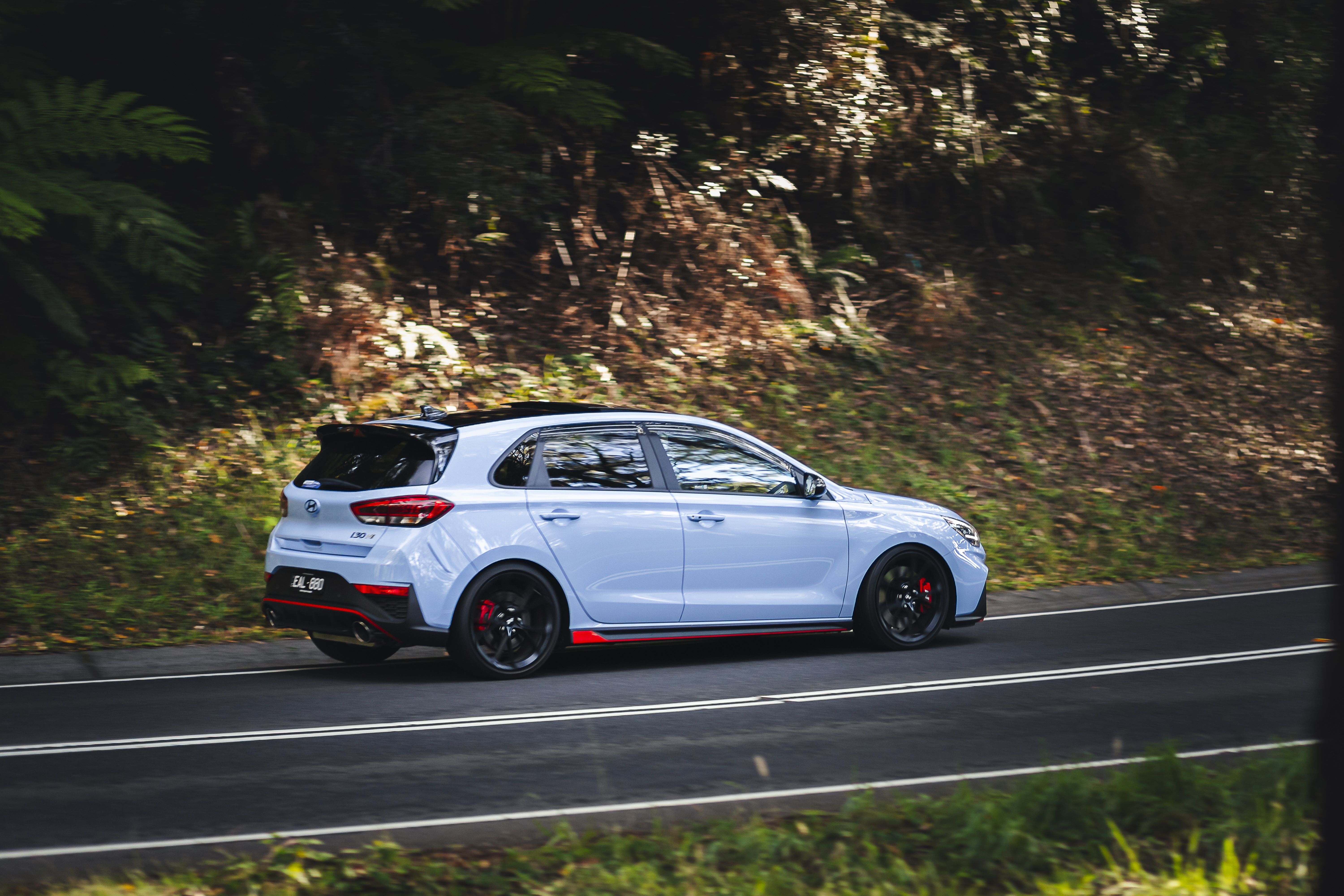 White hatchback with red accents driving on a tree-lined road.