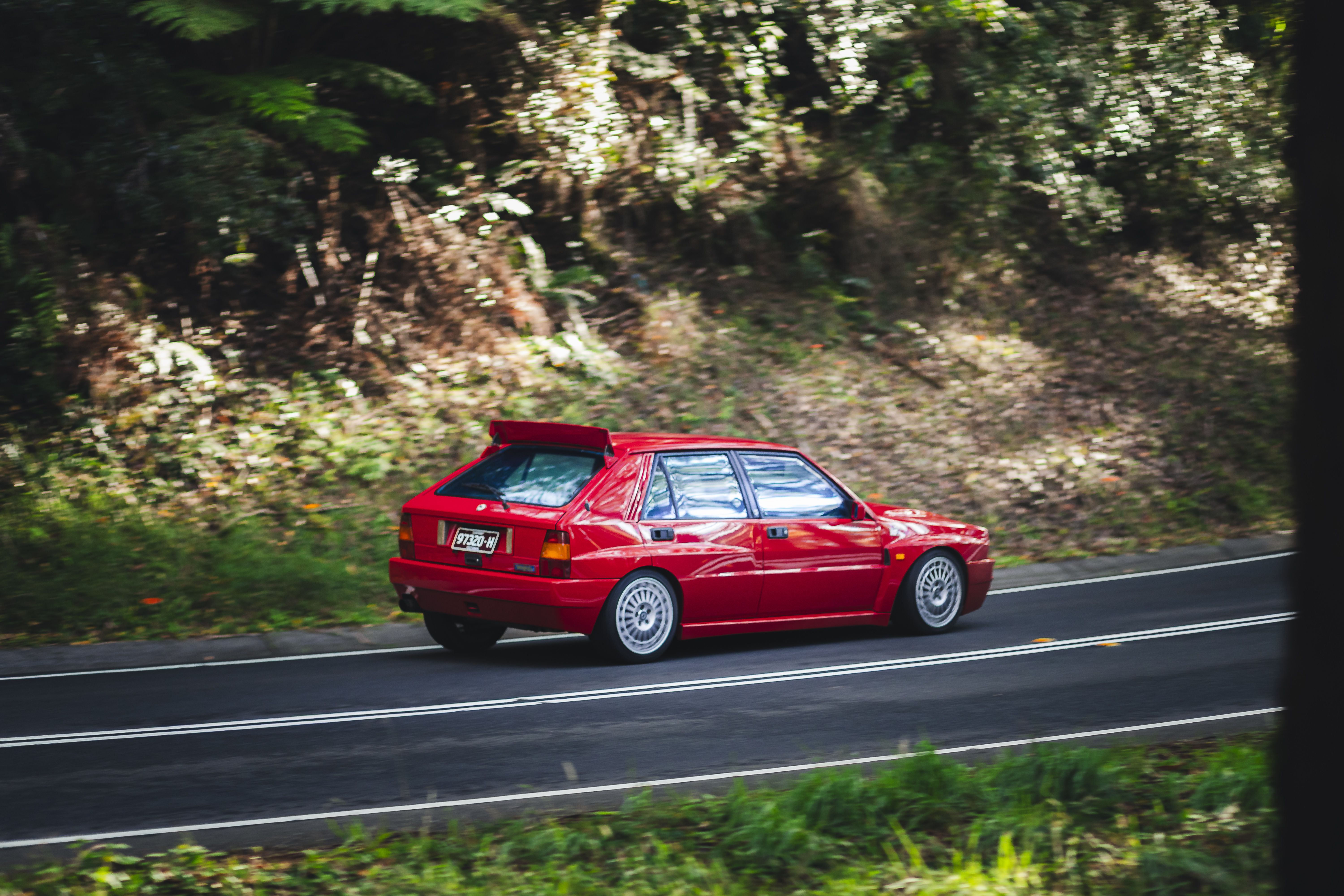 Red sedan driving on a forest road lined with green foliage and white flowering trees.