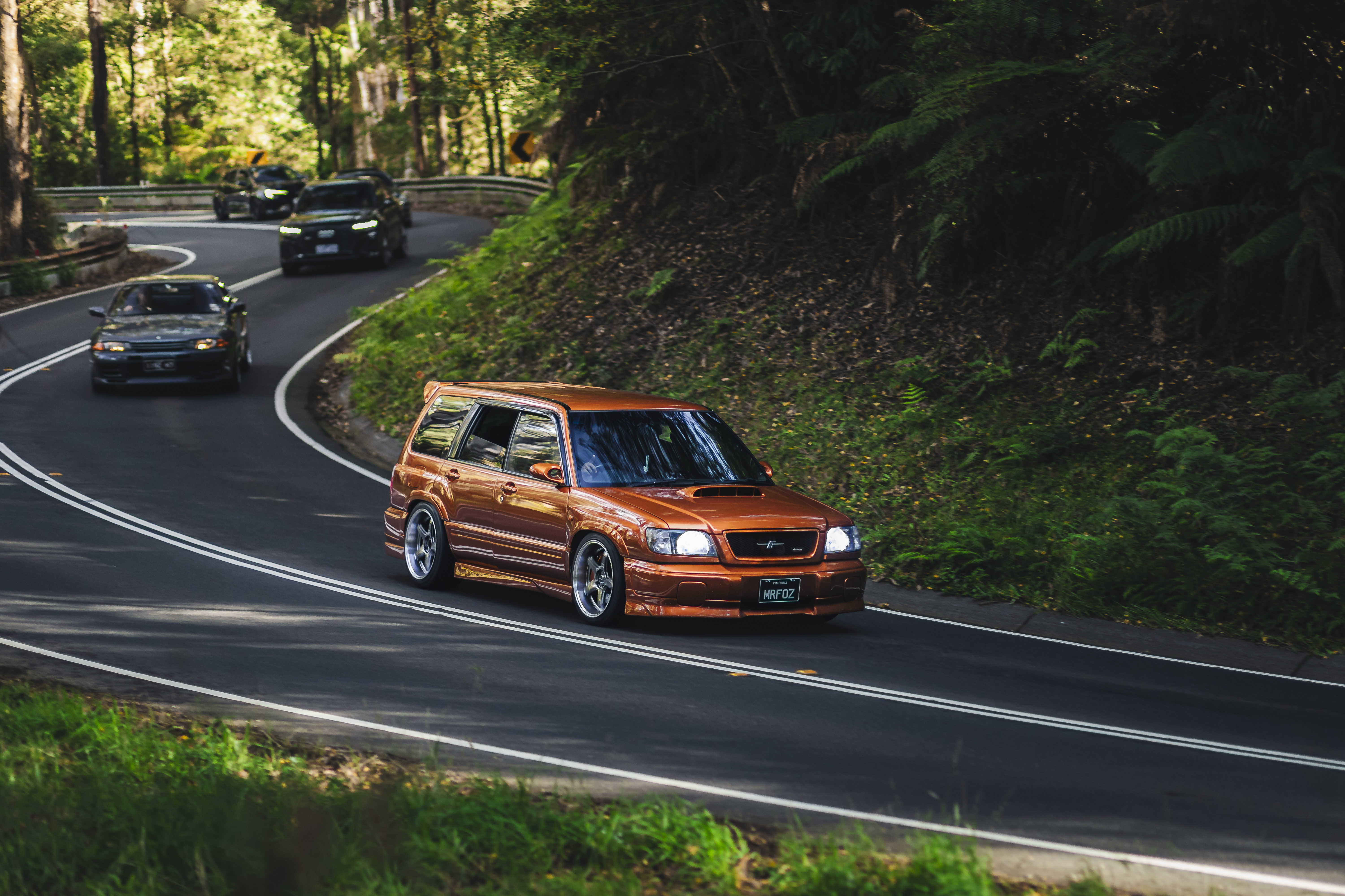 An orange SUV leads a convoy of cars through a forested mountain road with tight curves and dense green vegetation on both sides.