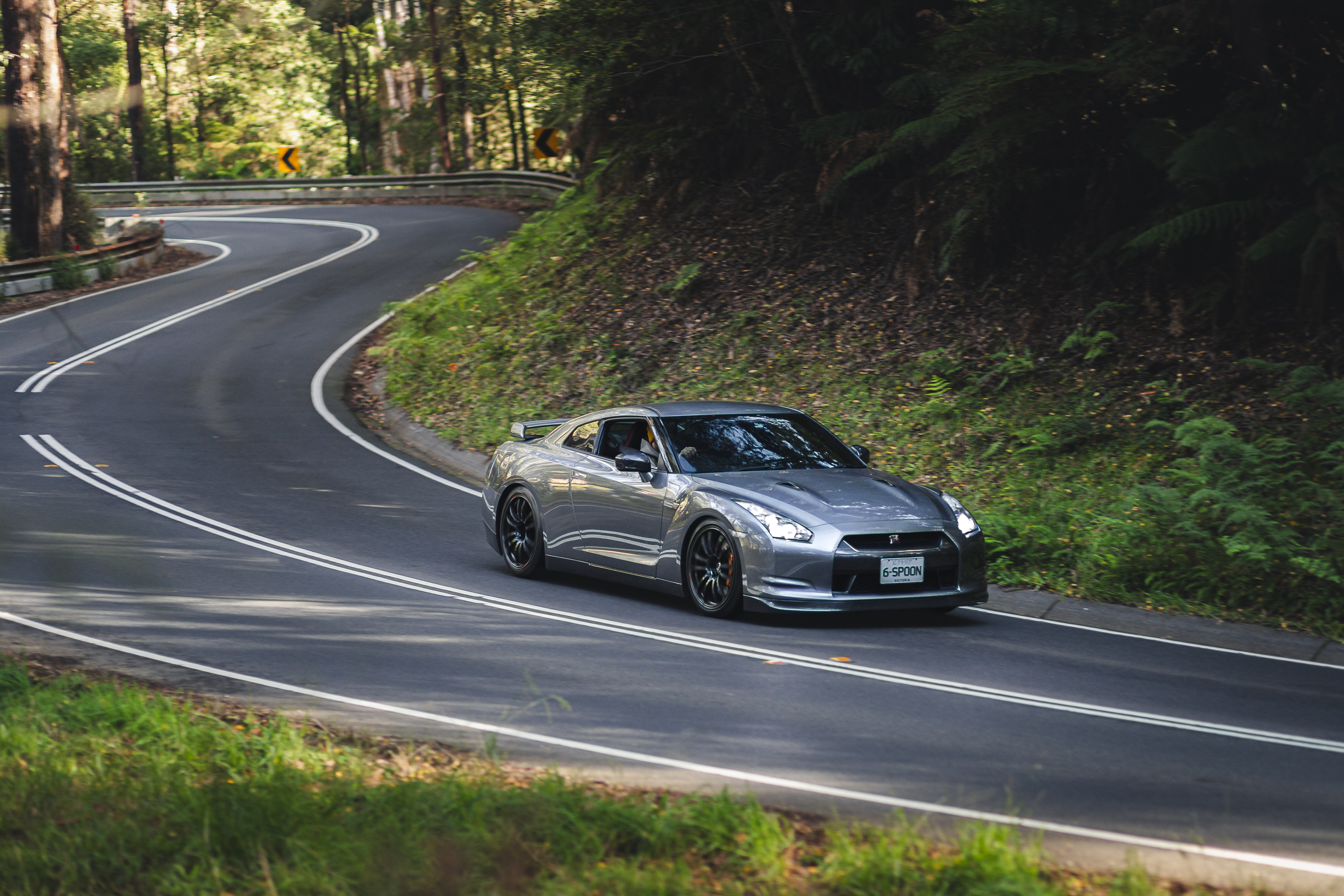 Silver sports car navigating a curved forest road with dense green vegetation on both sides.