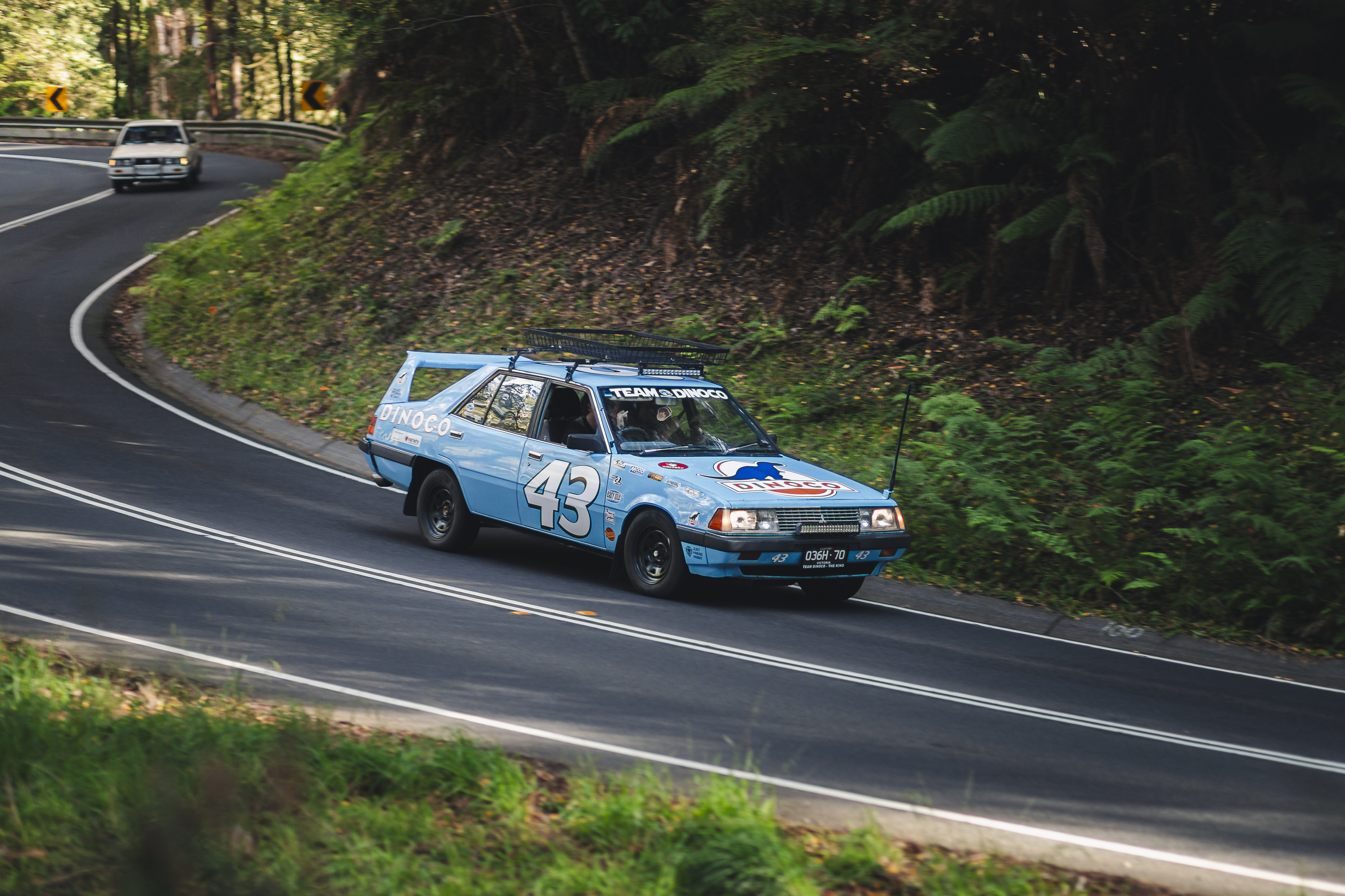 Blue race car number 43 navigating a winding forest road with lush green vegetation on the hillside.