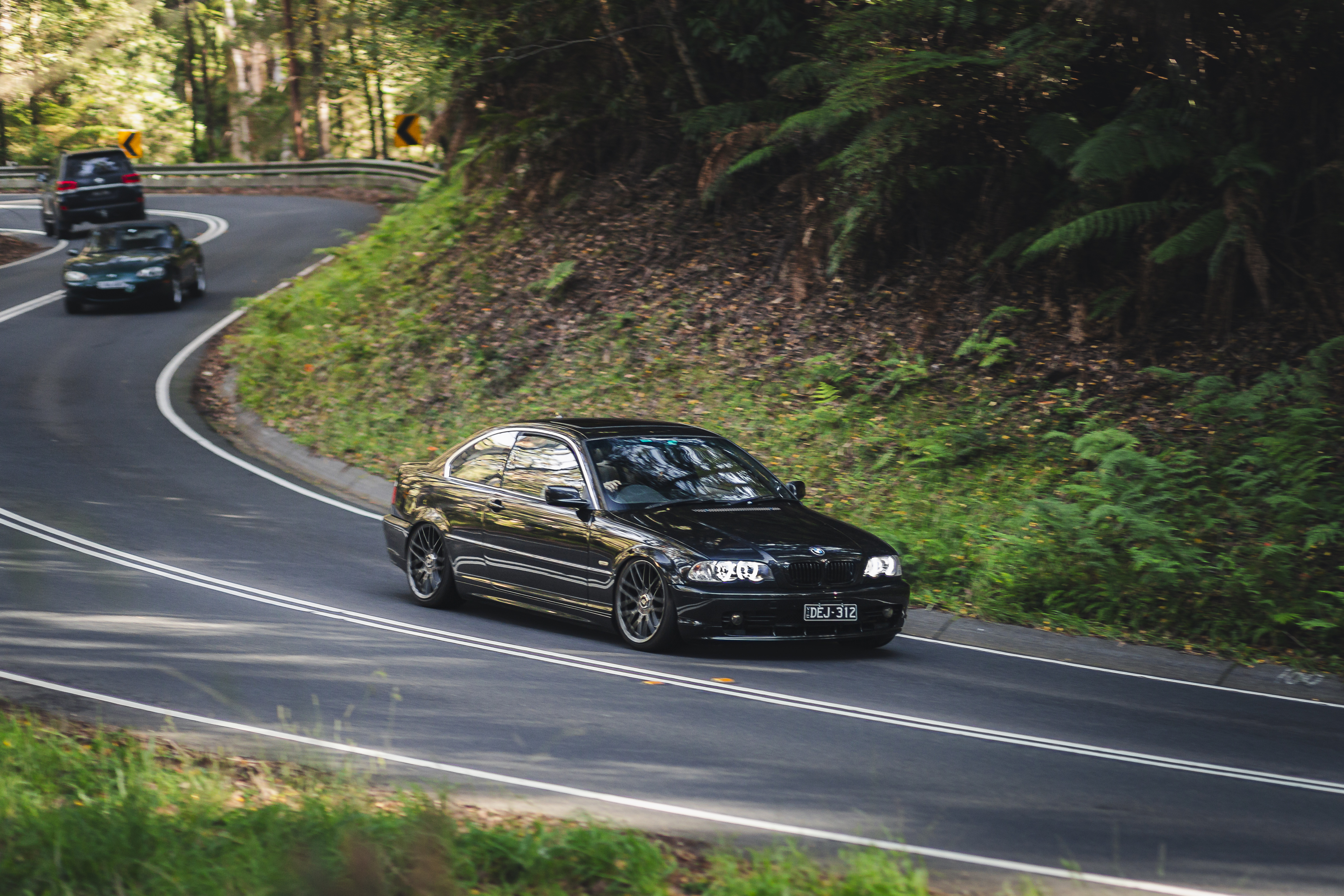 Black sedan navigating a tight curve on a forested mountain road with lush green vegetation on the hillside.