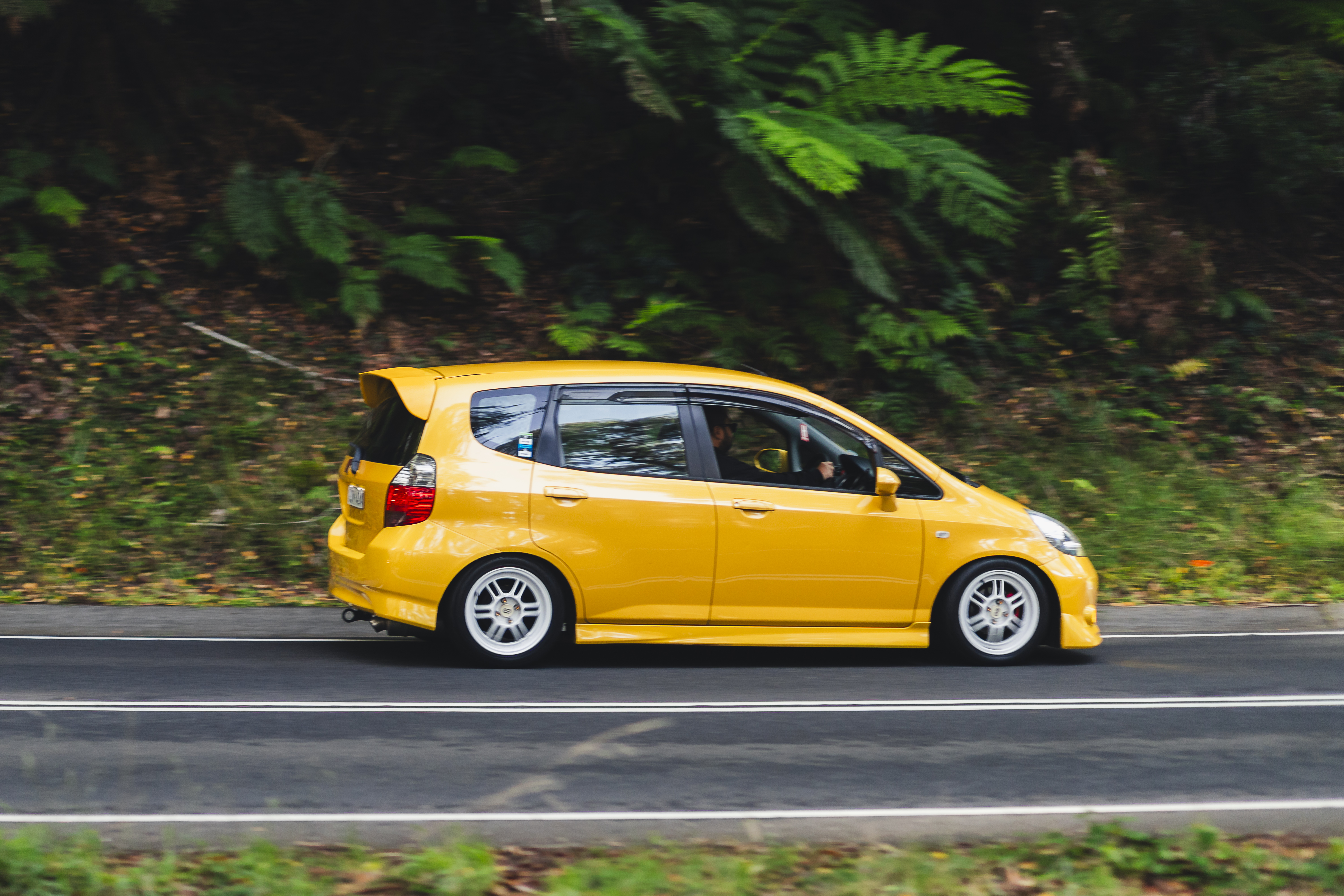 Yellow compact hatchback driving on a road bordered by dense green foliage.