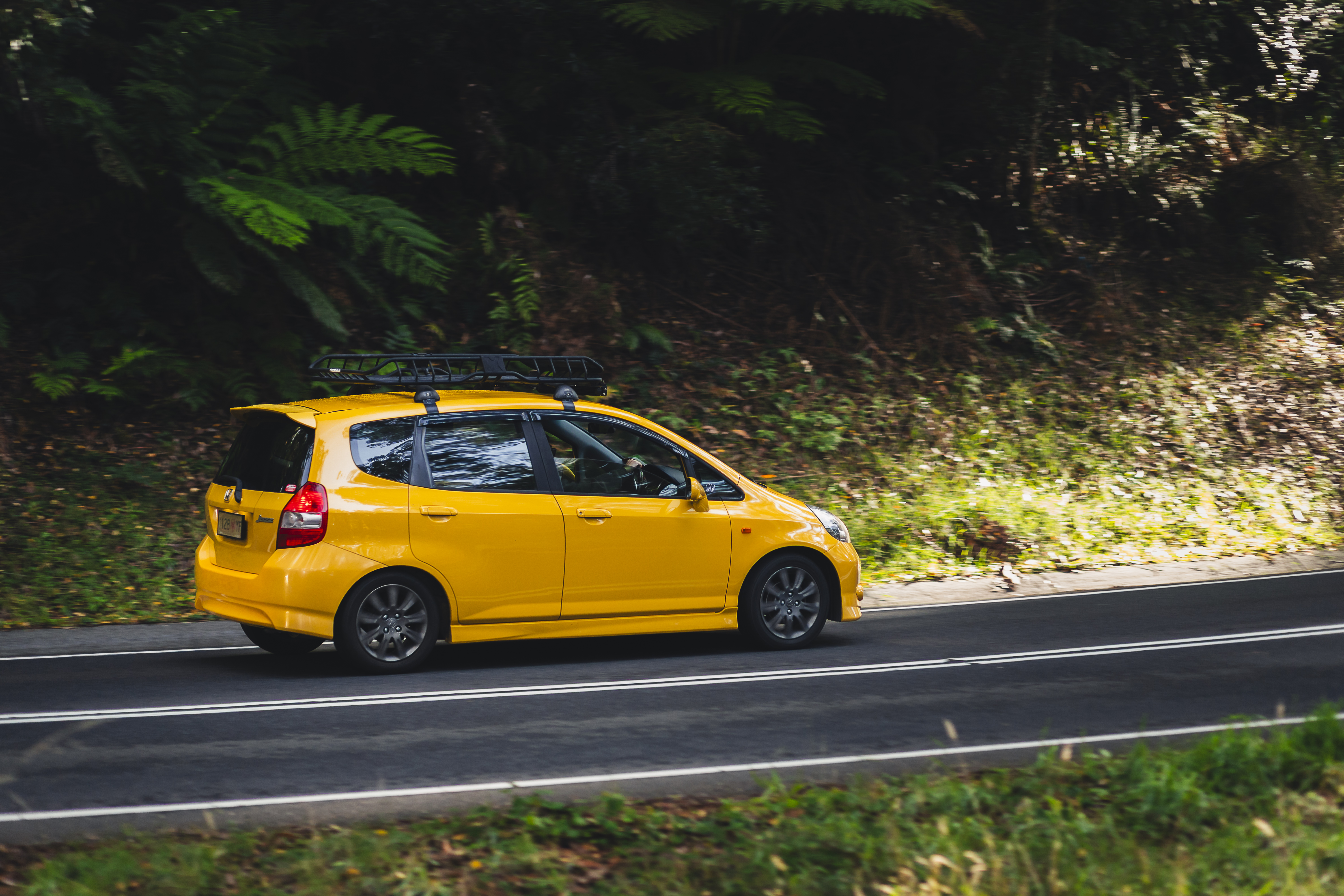 Yellow compact car with roof rack driving on a curved road lined with dense green foliage.