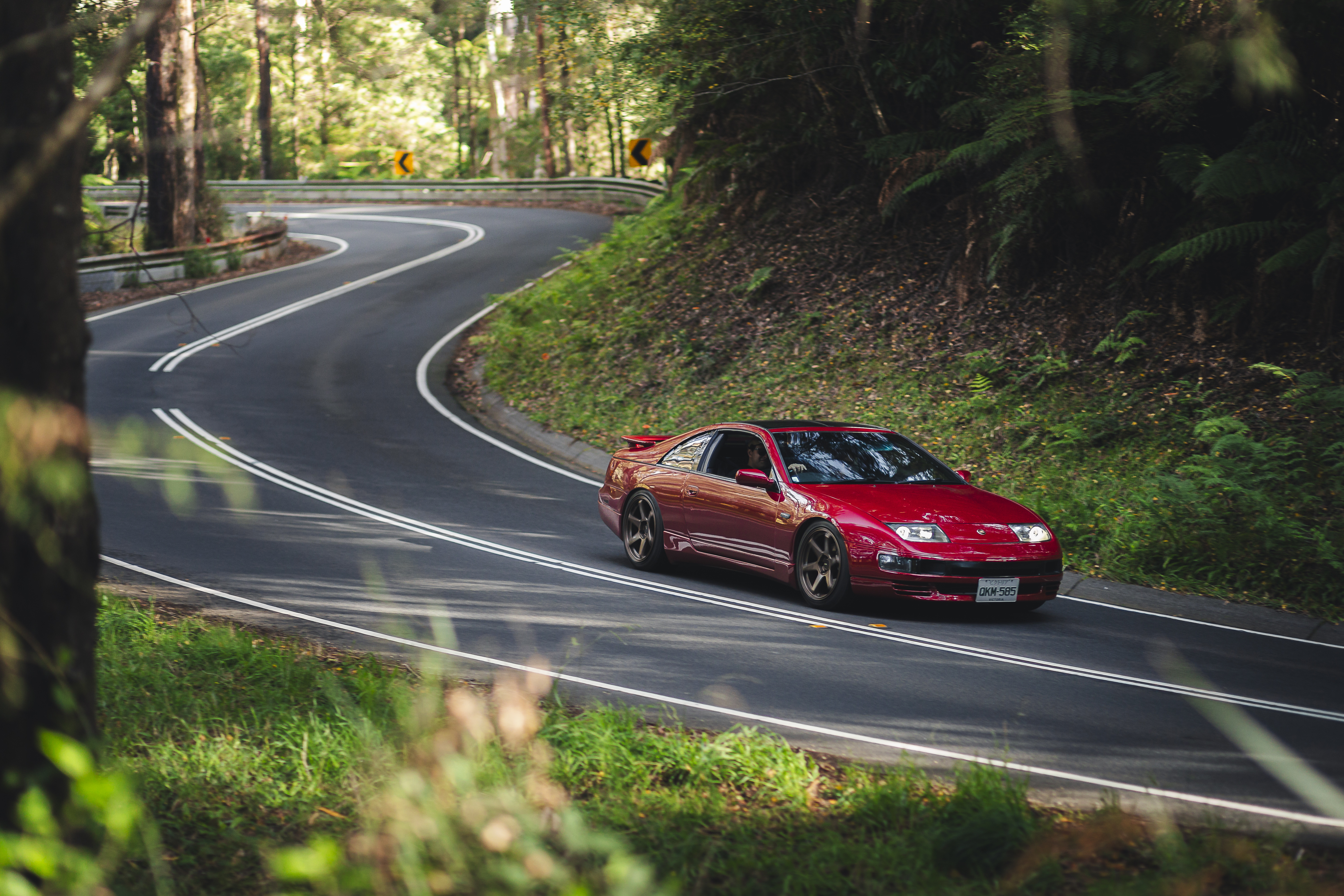 Red sports car navigating a winding forest road with white center line markings.