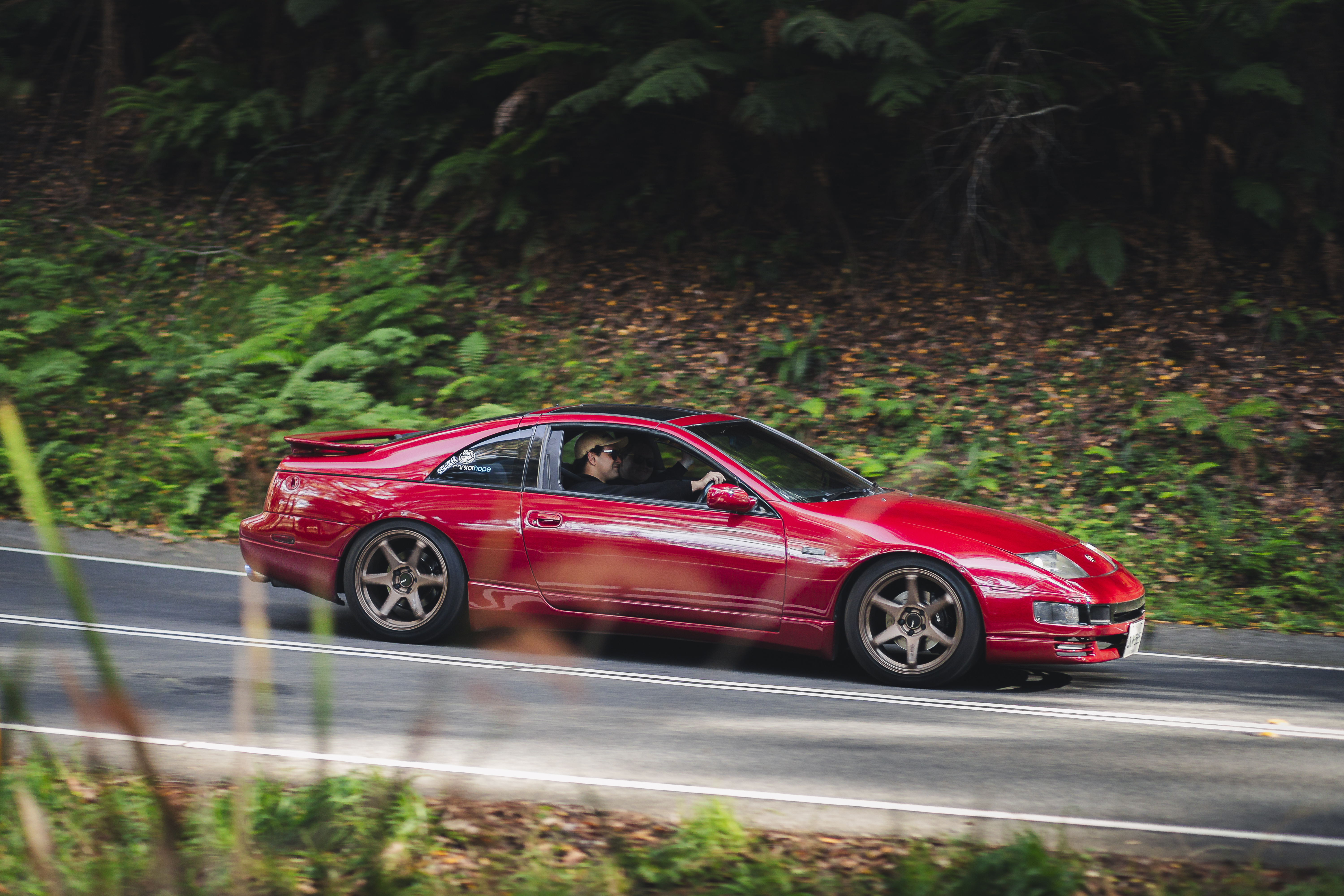 A red sports car drives along a tree-lined road with lush green foliage in the background.