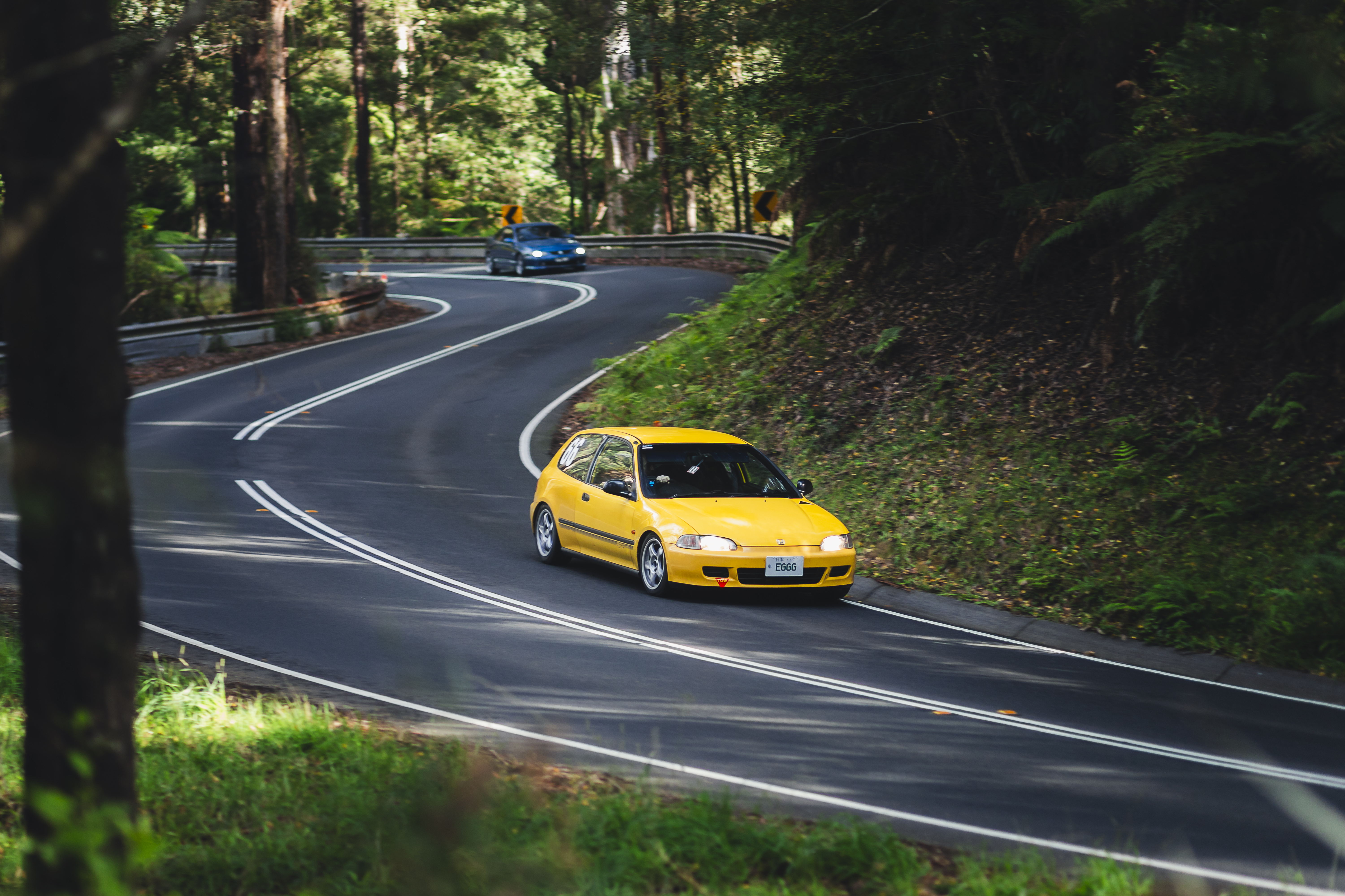 Yellow sports car navigating a curved forest road with a blue car visible in the distance.