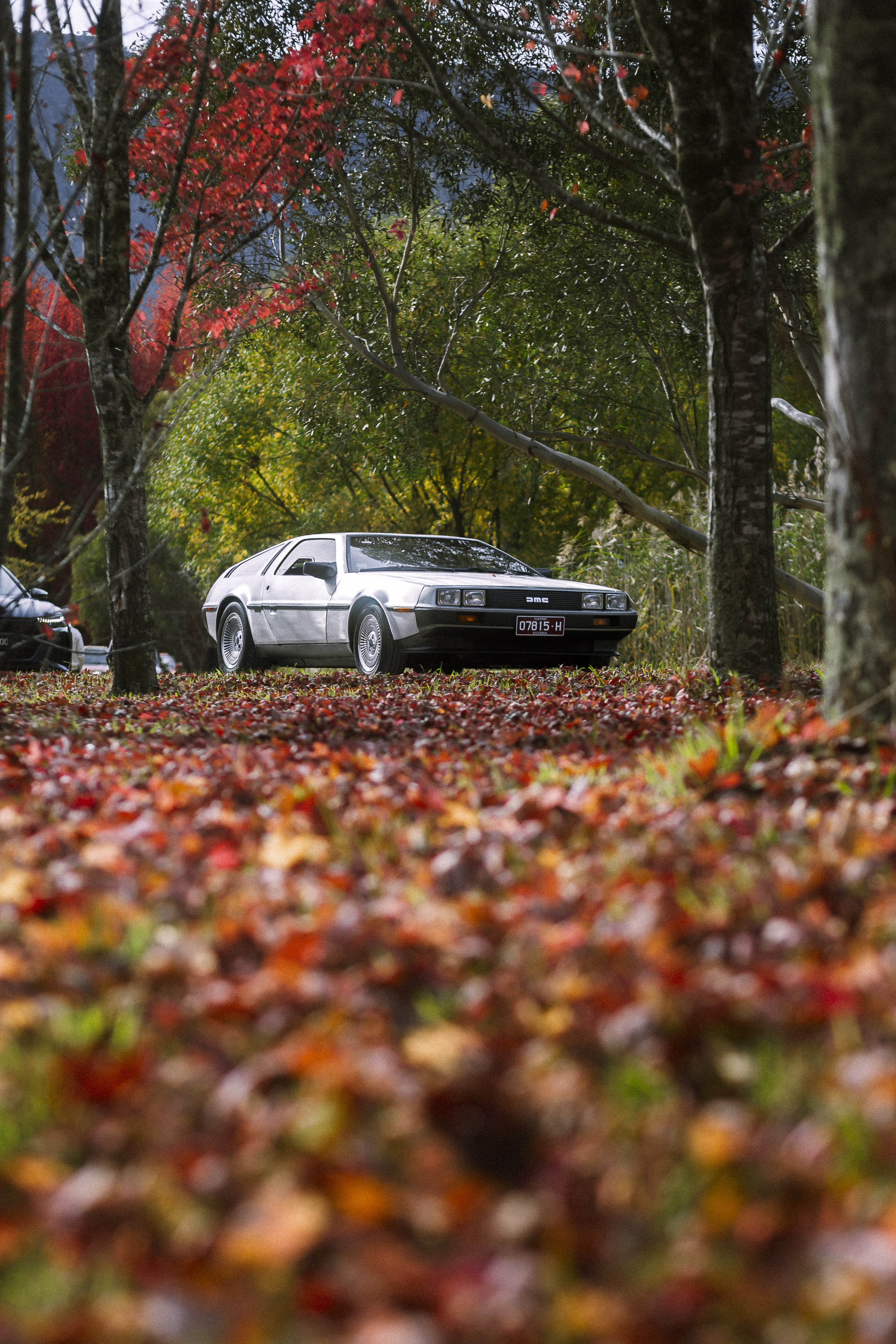 White DeLorean parked beneath autumn trees with fallen red leaves covering the ground.