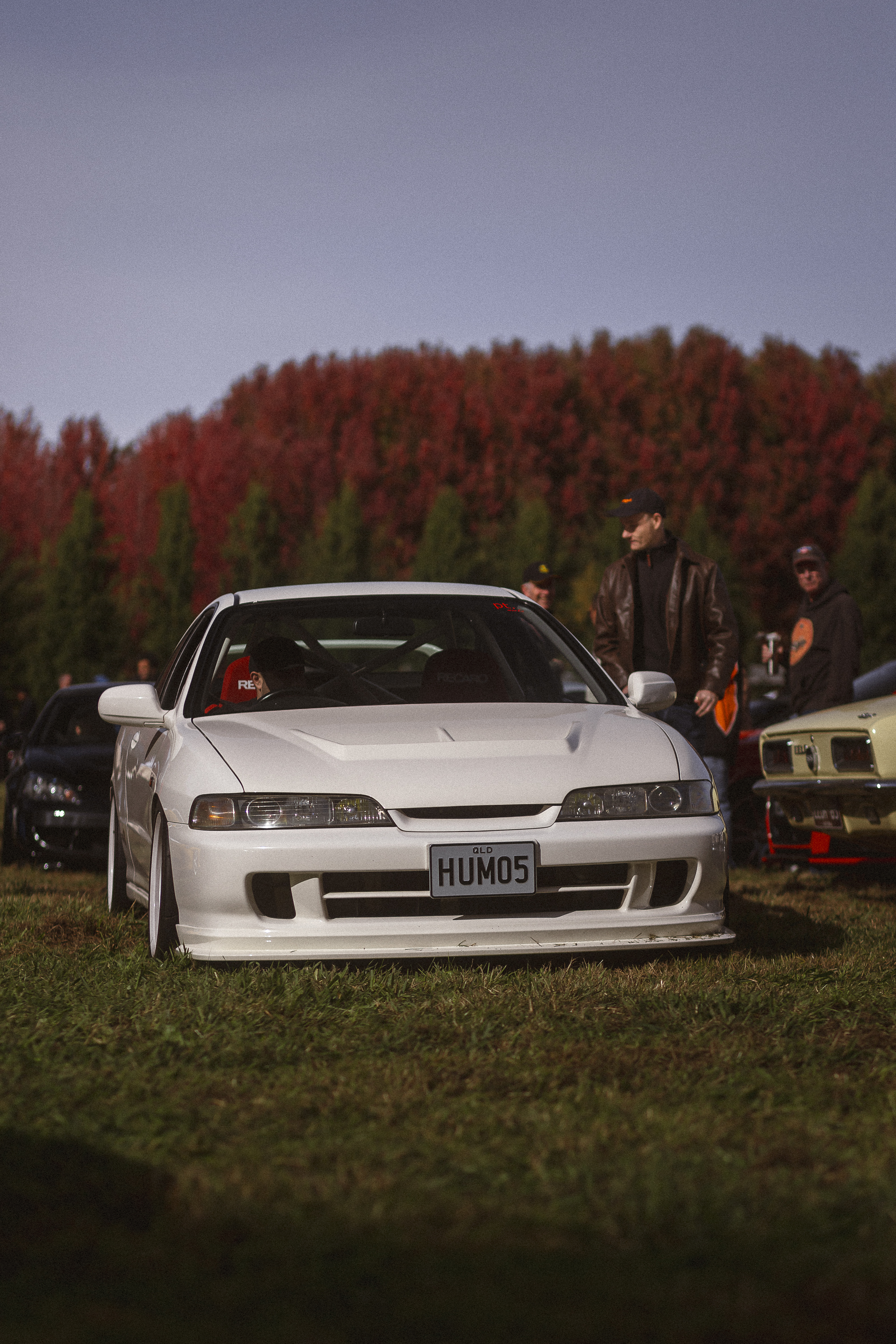White sedan meets autumn foliage
