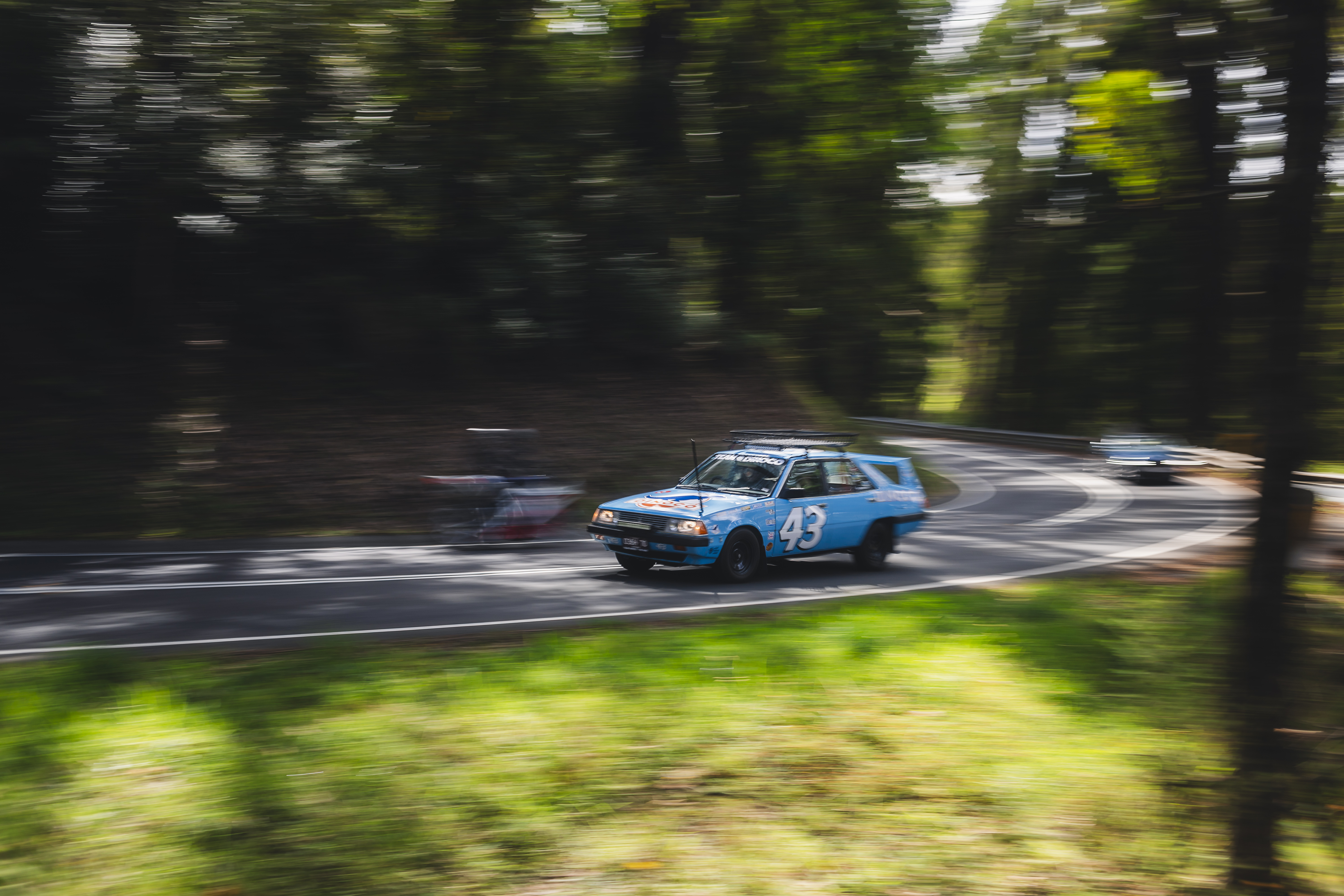 A blue and orange race car numbered 43 drives through a tree-lined road with motion blur around the foreground.