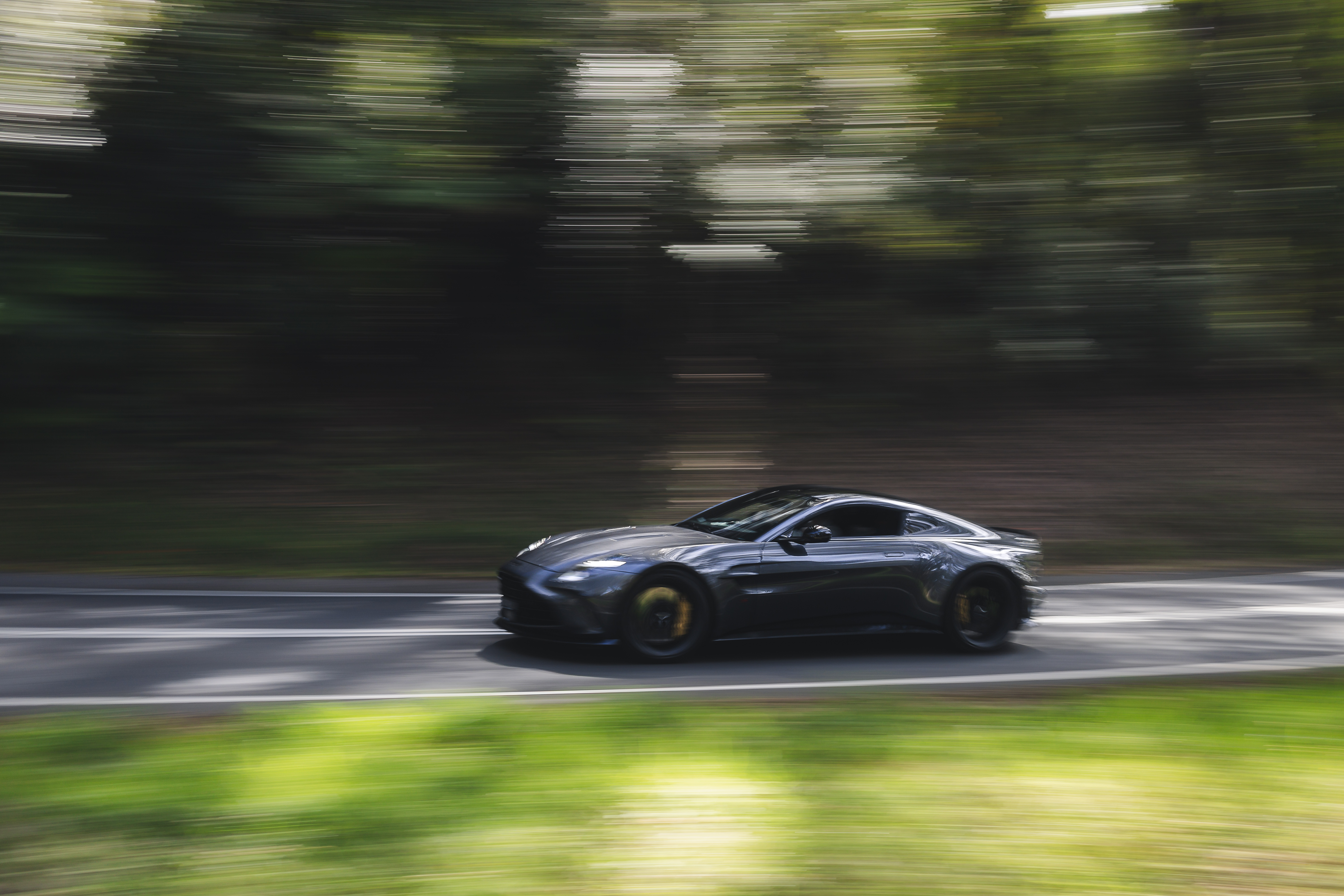 Dark blue sports car driving on a tree-lined road with motion blur effect