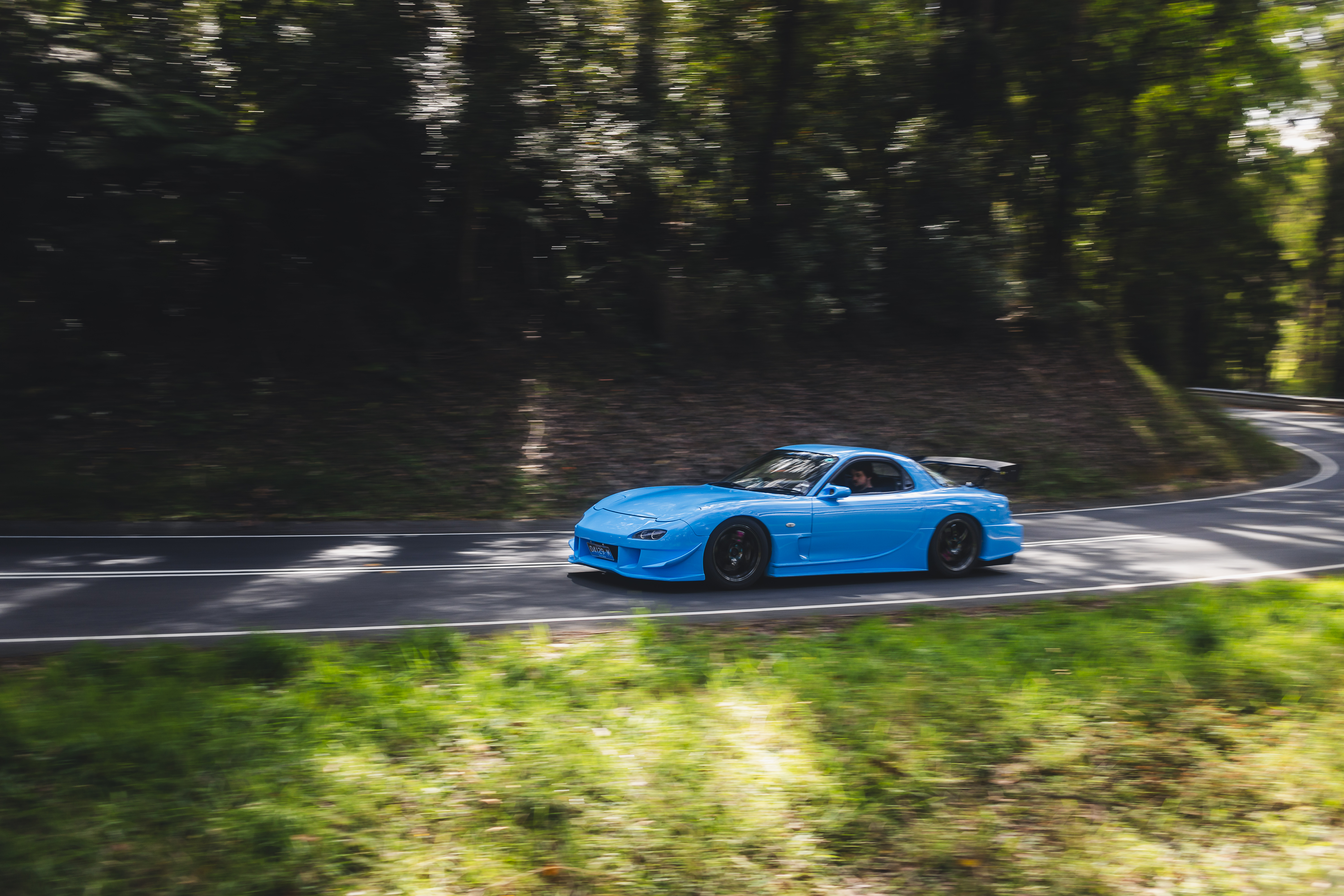 Bright blue sports car navigating a curved forest road with trees lining both sides.