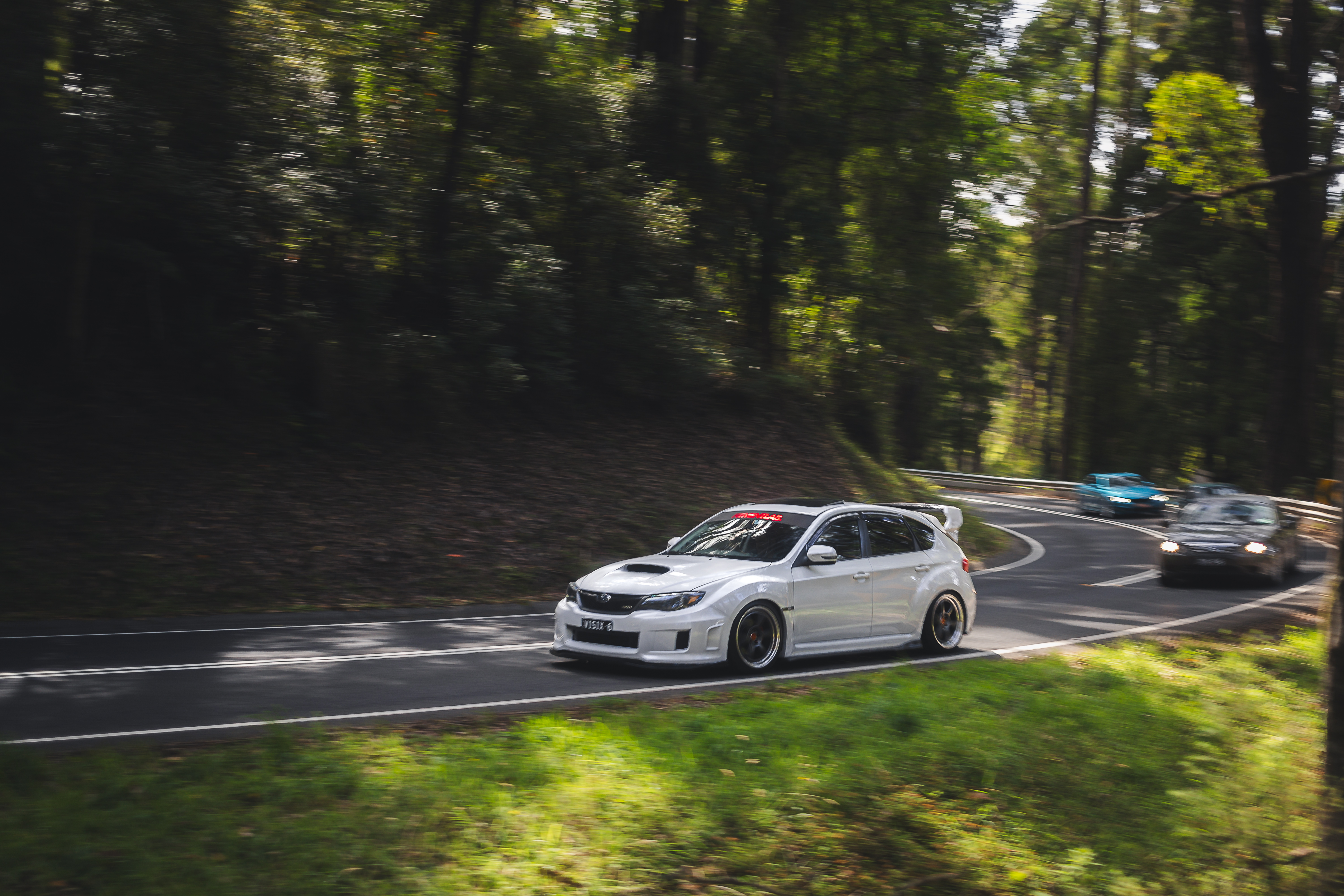 White sport hatchback cornering on a tree-lined road with other vehicles visible in the background.