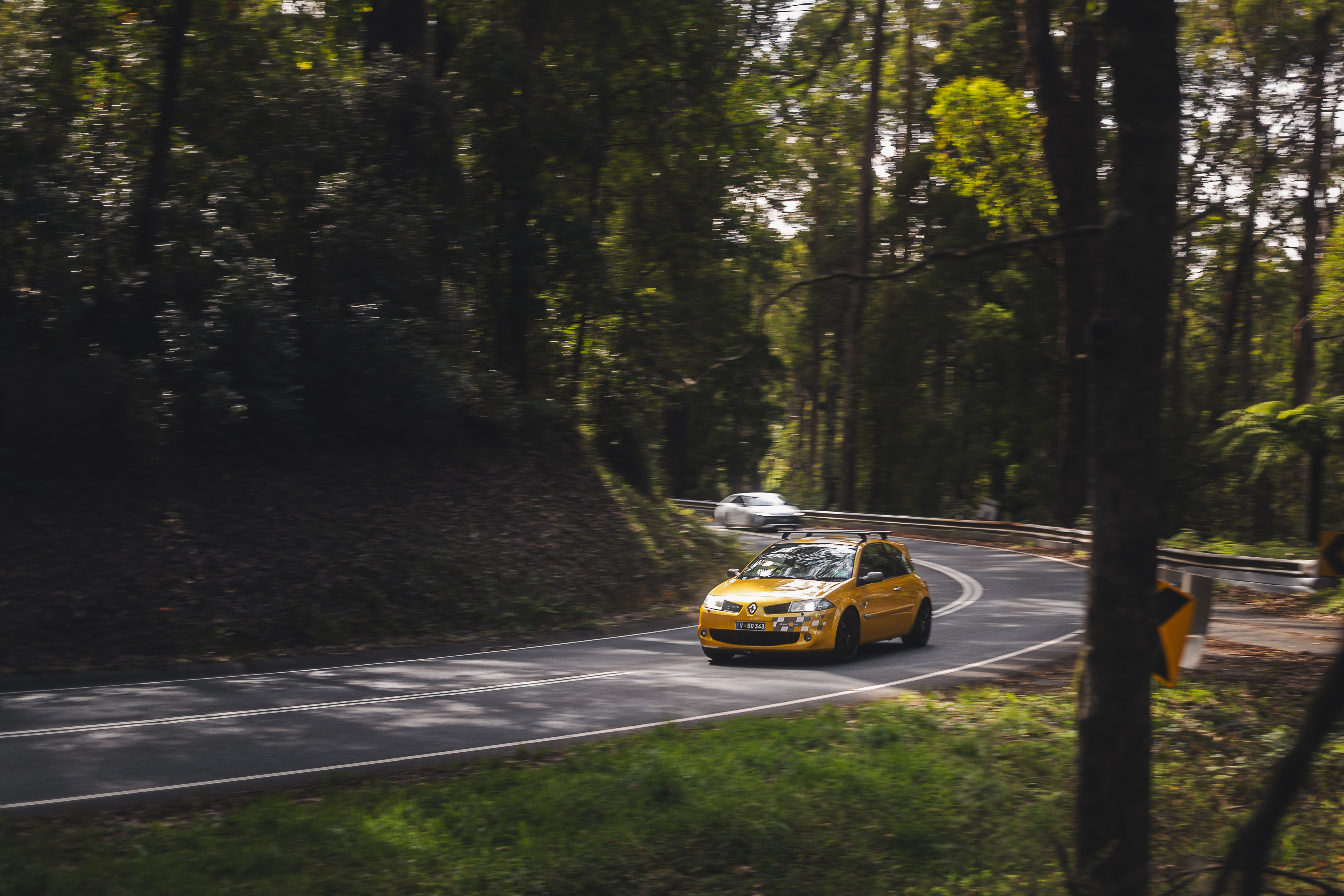 A yellow compact car cornering through a wooded road with a white vehicle visible behind it.