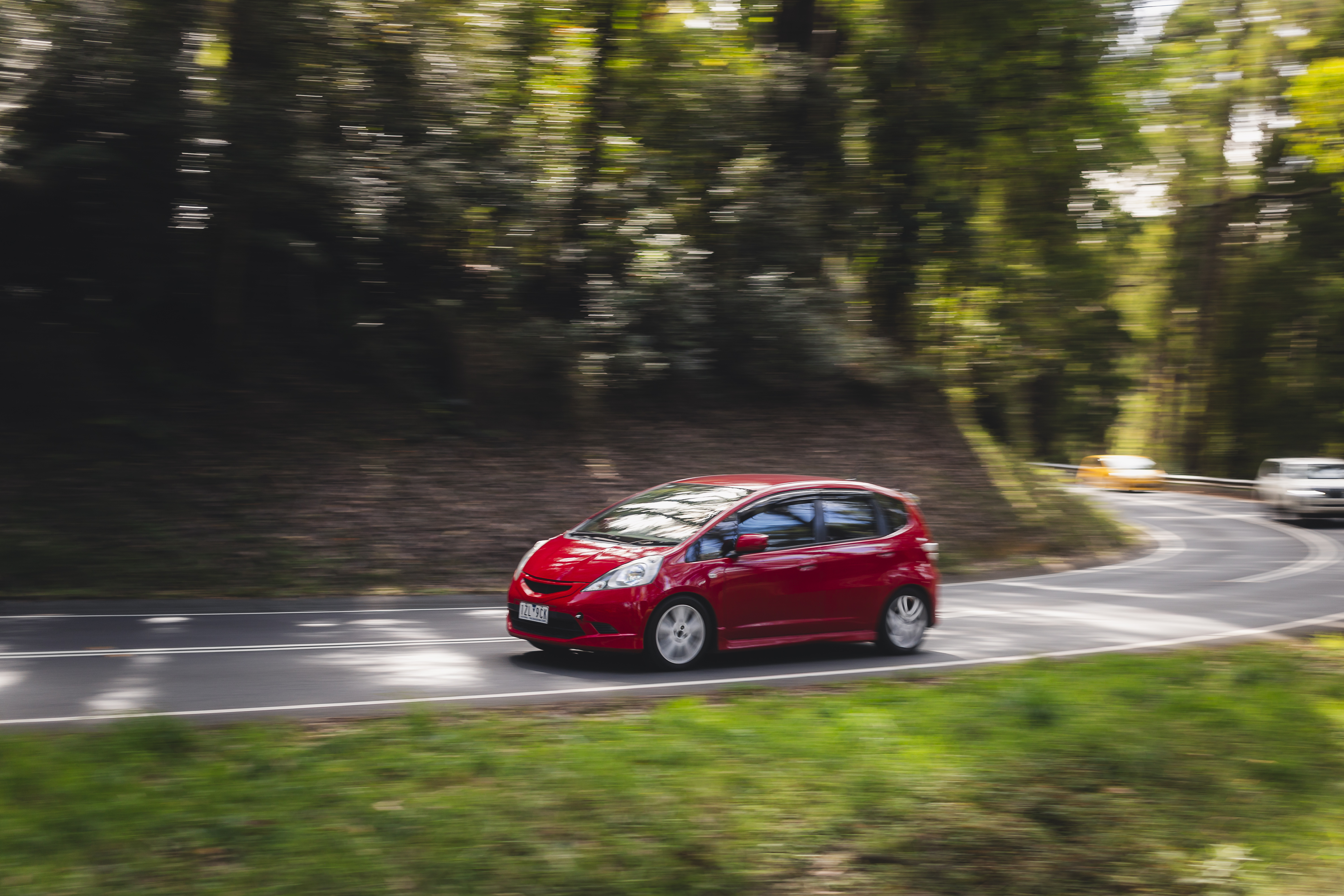 Red compact hatchback driving through a tree-lined road with motion blur in the background.