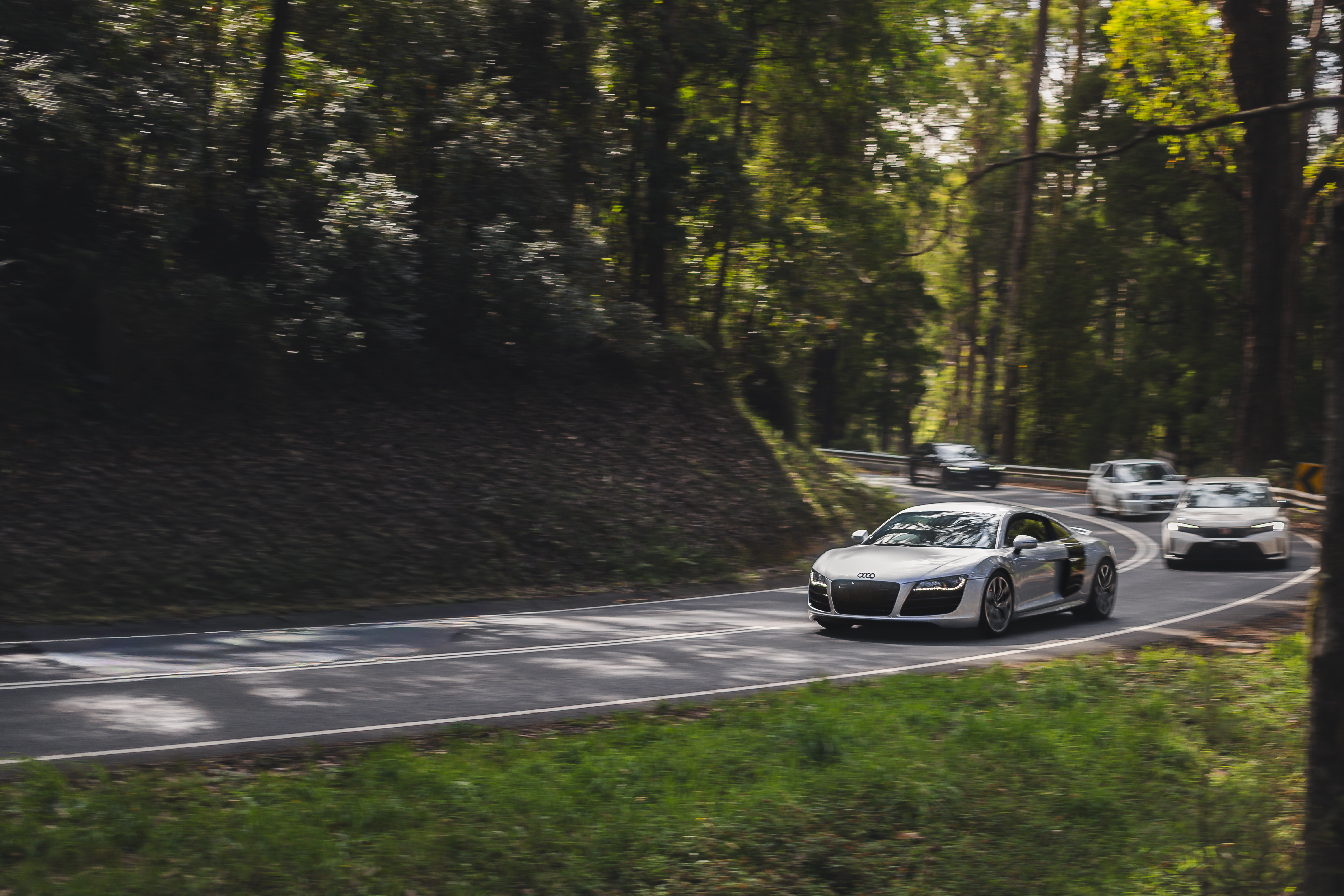 A silver Audi supercar leads a convoy of vehicles through a forested road with dense green trees lining both sides.