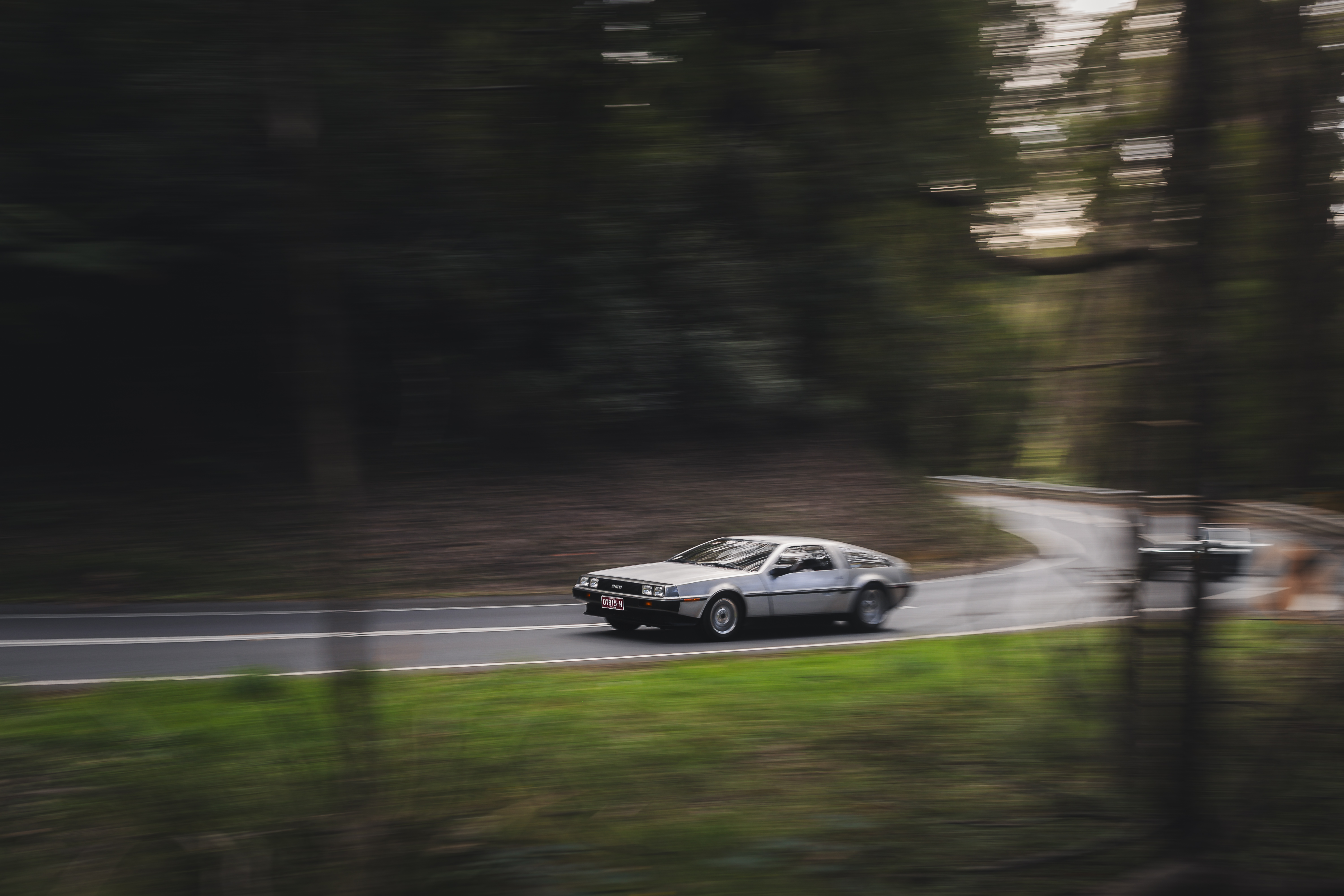 A silver DeLorean sports car driving on a road lined with trees, captured with motion blur.